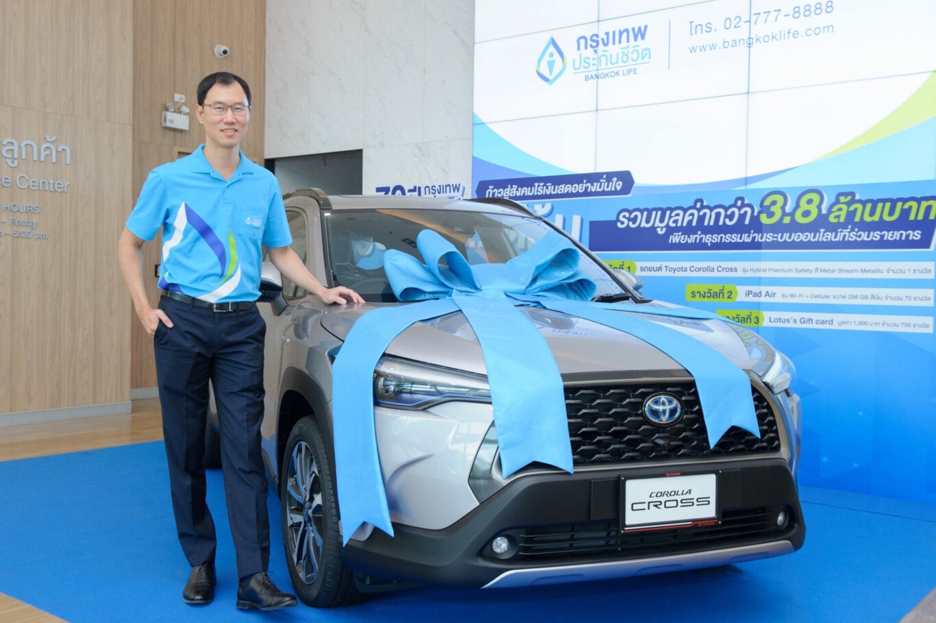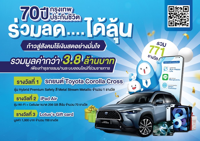 กรุงเทพประกันชีวิต ส่งเสริมการก้าวสู่สังคมไร้เงินสดอย่างมั่นใจ ลดการใช้ทรัพยากร พร้อมให้ผู้เอาประกันสามารถทำธุรกรรมผ่านระบบออนไลน์ได้อย่างสะดวกปลอดภัย ทุกที่ ทุกเวลา ในแคมเปญสุดพิเศษ 70 ปี กรุงเทพประกันชีวิต ร่วมลด….ได้ลุ้น มอบสิทธิ์ลุ้นรางวัลมากมาย อาทิ รถยนต์ Toyota Corolla Cross,  iPad Air, และบัตรกำนัล รวมมูลค่าสูงสุด 3.8 ล้านบาท ทั้งสิ้นจำนวน 771 รางวัล