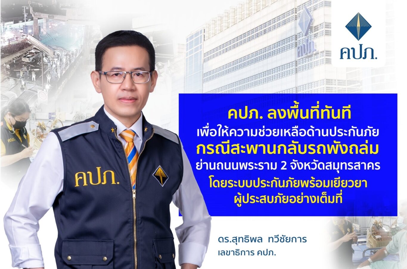 ดร.สุทธิพล ทวีชัยการ เลขาธิการคณะกรรมการกำกับและส่งเสริมการประกอบธุรกิจประกันภัย (เลขาธิการ คปภ.) เปิดเผยว่า จากกรณีสะพานกลับรถหน้าโรงพยาบาลวิภาราม กม.ที่ 34 ตำบลบางกระเจ้า อำเภอเมือง จังหวัดสมุทรสาคร ที่อยู่ระหว่างการปิดซ่อมบำรุง พังถล่มลงมาทับรถยนต์ที่สัญจรอยู่บนถนนพระราม 2 ช่องทางด่วน ขาเข้ากรุงเทพฯ ส่งผลทำให้รถยนต์ได้รับความเสียหายหลายคัน และทำให้มีผู้เสียชีวิต 2 ราย บาดเจ็บ 5 ราย เหตุเกิดเมื่อวันที่ 31 กรกฎาคม 2565 นั้น เบื้องต้นได้สั่งการให้สายคุ้มครองสิทธิประโยชน์ บูรณาการร่วมกับสายส่งเสริมและประกันภัยภูมิภาค สำนักงาน คปภ. ภาค 7 (นครปฐม) และสำนักงาน คปภ. จังหวัดสมุทรสาคร ในฐานะเจ้าของพื้นที่เกิดเหตุ ตรวจสอบการทำประกันภัยพร้อมเร่งอำนวยความสะดวกด้านประกันภัยให้กับผู้ประสบภัย ตลอดจนติดตามรายงานความเสียหายอย่างเร่งด่วนผ่าน Platform การรายงานข้อมูลกรณีอุบัติภัยกลุ่มหรือรายใหญ่ด้วยระบบอิเล็กทรอนิกส์ รวมทั้งให้ลงพื้นที่เพื่ออำนวยความสะดวกด้านประกันภัยให้กับผู้ประสบภัยและครอบครัว เพื่อใช้ระบบประกันภัยช่วยบรรเทาความเดือดร้อนให้กับครอบครัวของผู้เสียชีวิตและผู้บาดเจ็บได้อย่างมีประสิทธิภาพและเป็นธรรม