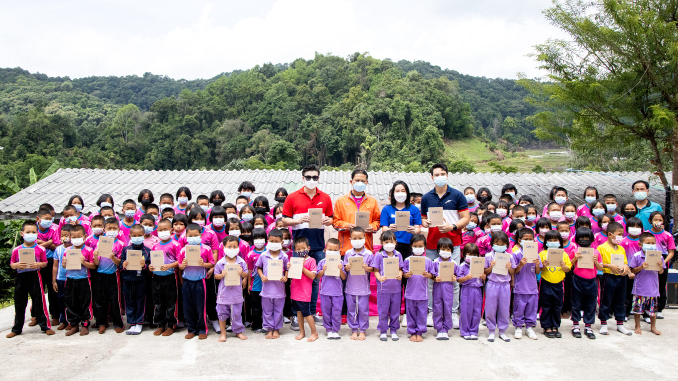 บมจ.กรุงไทย-แอกซ่า ประกันชีวิต นำโดย คุณสุกัญญา อิสรานุวัฒน์ชัย รองประธานอาวุโส ฝ่ายสื่อสารการตลาดและภาพลักษณ์องค์กร (กลาง) มอบสมุดปกพลาสติกรีไซเคิล จากกิจกรรม “Think ก่อนทิ้ง” ภายใต้แคมเปญ “Commit to Climate เราปรับ โลกเปลี่ยน” จำนวน 1,000 เล่ม แก่นักเรียนโรงเรียนนิยมไพรผาหมอน อินทนนท์ อำเภอจอมทอง จังหวัดเชียงใหม่