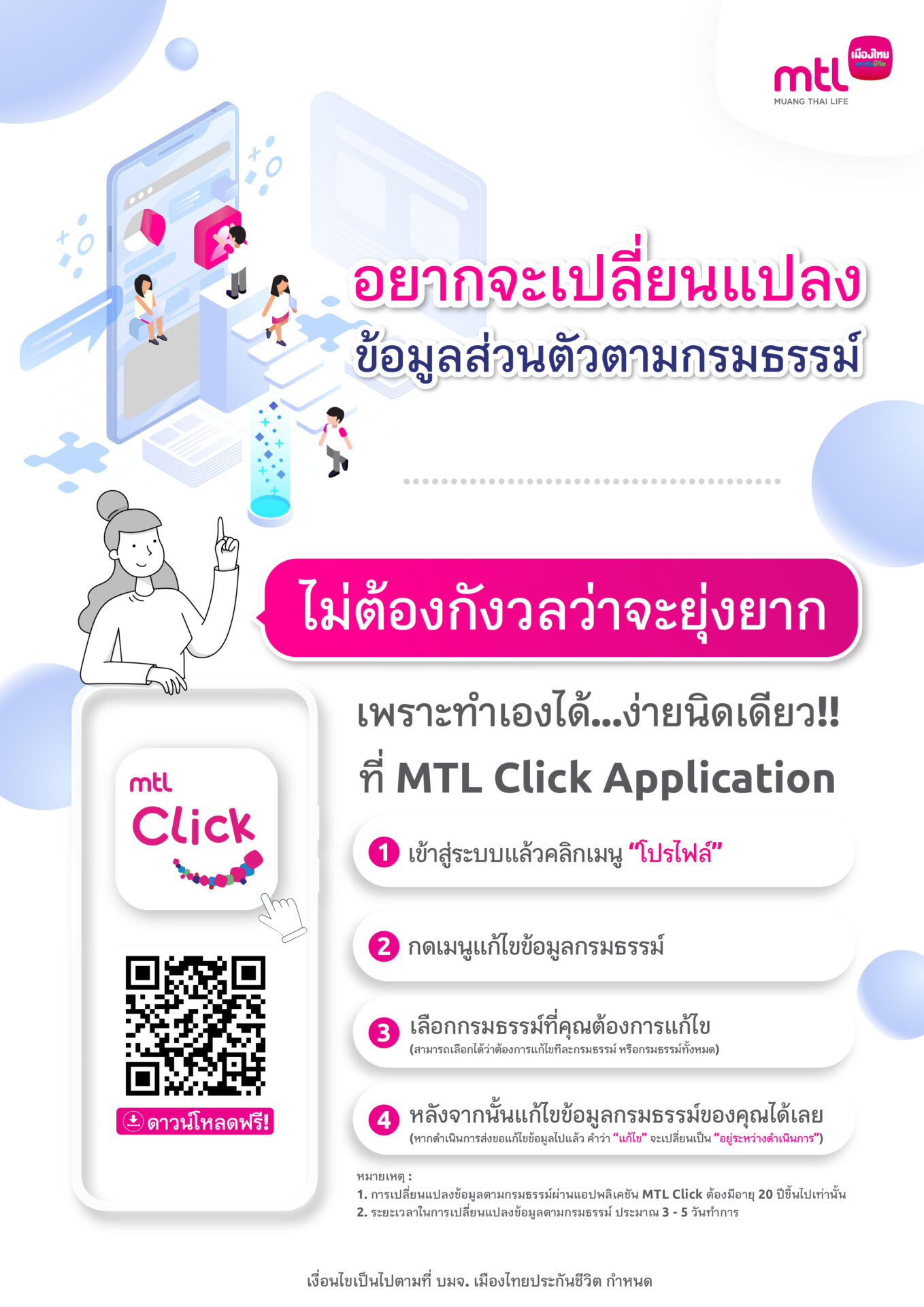 เมืองไทยประกันชีวิต มอบความสะดวก ให้ลูกค้าสามารถเปลี่ยนแปลงข้อมูลส่วนตัว ตามกรมธรรม์ได้ง่ายๆ และปลอดภัย ผ่านแอปพลิเคชัน MTL Click
