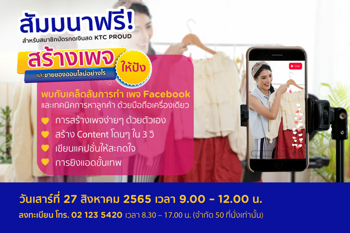 “เคทีซี” หรือ บริษัท บัตรกรุงไทย จำกัด (มหาชน) ขอเชิญสมาชิกบัตรกดเงินสด “เคทีซี พราว” ที่สนใจเข้าร่วมสัมมนาติดอาวุธทางอาชีพ “สร้างเพจและขายของออนไลน์อย่างไรให้ปัง” โดยไม่เสียค่าใช้จ่าย ในวันเสาร์ที่ 27 สิงหาคม 2565 เวลา 09.00 น. – 12.00 น. ณ ห้องประชุมใหญ่ 11-01 ชั้น 11 อาคารสมัชชาวาณิช 2 (ต้นซอยสุขุมวิท 33)