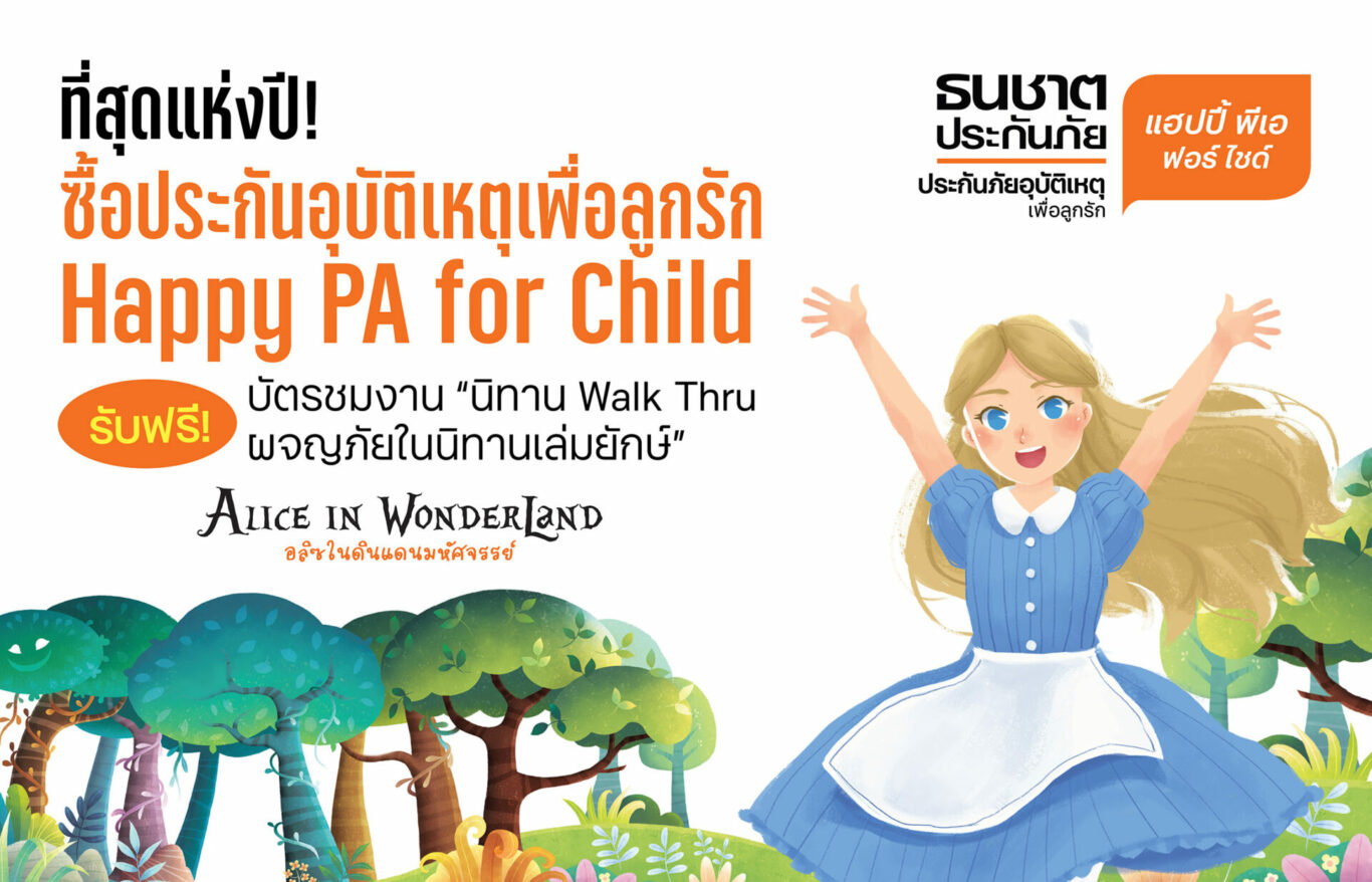 ธนชาตประกันภัย ชวนว้าวแบบยกกำลังสอง ว้าวแรกกับ “Happy PA for Child” ประกันภัยนวัตกรรมใหม่ที่พัฒนาออกมาในรูปแบบไฮบริด ผสมผสานระหว่างประกันภัยอุบัติเหตุและประกันภัยสุขภาพสำหรับกลุ่มครอบครัว ที่คุ้มครองครบ จบทั้งอุบัติเหตุและโรคฮิตในเด็ก และงานเด็กที่ว้าวที่สุดแห่งปี 2565 งาน “รักลูกนิทาน Walk Thru การผจญภัยในนิทานเล่มยักษ์” เพียงแค่ทำประกันภัยที่ทีเอ็มบีธนชาตตั้งแต่วันนี้ – 31 ตุลาคม 2565 รับฟรี!บัตรเข้าชมงานนิทานในดวงใจผจญภัยไปกับอลิซในดินแดนมหัศจรรย์ (Alice in Wonderland) งานนิทาน Pop-up ขนาดใหญ่ ที่เตรียมยกขบวนบุกไปเติมเต็มจินตนาการให้กับน้องๆ ใน 6 จังหวัด ตั้งแต่เดือนสิงหาคมถึงเดือนพฤศจิกายนนี้