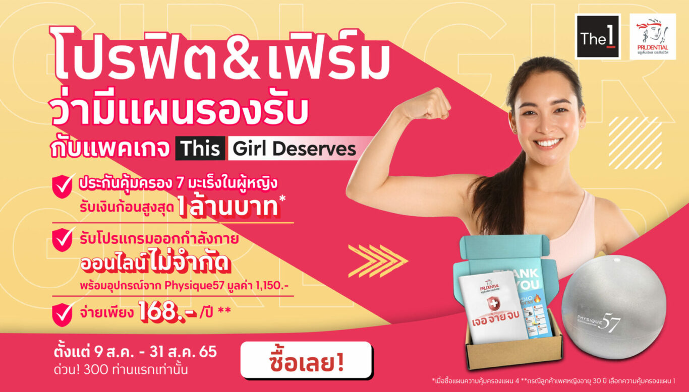 นอกจากนี้ เพื่อให้ผู้หญิงได้ดูแลสุขภาพตัวเองให้ดีอยู่เสมอและเป็นการป้องกันการเจ็บป่วย The 1 และ พรูเด็นเชียล ประเทศไทย นำเสนอแพ็กเกจ This girl deserves แพ็กเกจที่มาพร้อมความคุ้มครองมะเร็งสูงสุด 1 ล้านบาท และโปรแกรมออกกำลังกายออนไลน์ไม่จำกัด พร้อมอุปกรณ์จาก Physique 57 สามารถดูรายละเอียดได้ที่ https://cutt.ly/DXnLZVg ตั้งแต่วันที่ 9-31 สิงหาคม 2565