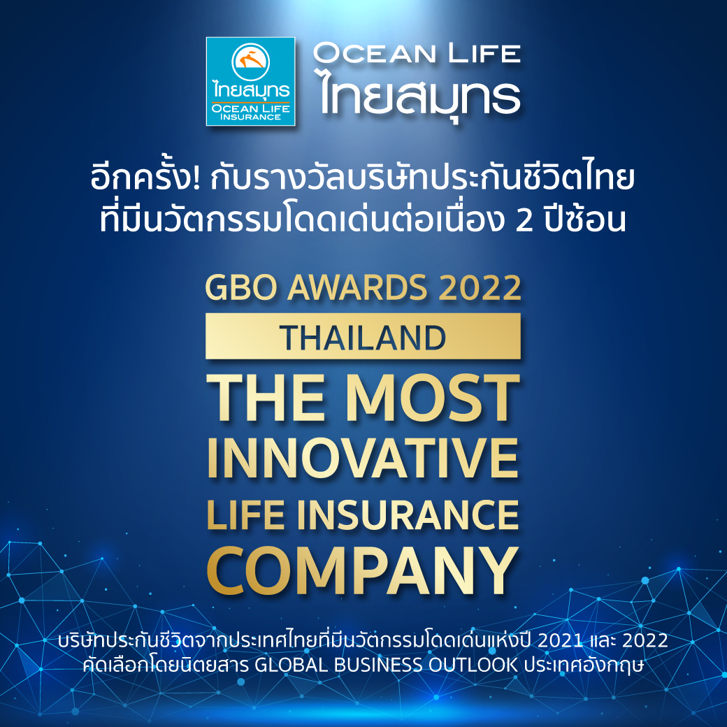 โดยในปีนี้เราได้พัฒนานวัตกรรมการประกันชีวิตที่เป็นรูปธรรม และชัดเจนมากขึ้น ด้วยความมุ่งมั่นดังกล่าวส่งผลให้บริษัทได้รับรางวัล GBO Awards 2022 : Most Innovative Life Insurance Company จากนิตยสาร Global Business Outlook ประเทศอังกฤษ ในหมวดธุรกิจประกันชีวิตของประเทศไทยที่มีความโดดเด่นในด้านนวัตกรรมการประกันชีวิต ต่อเนื่องเป็นปีที่ 2 โดยพิจารณาจากความสามารถในการบริหารจัดการนวัตกรรมยอดเยี่ยมระดับสากล และมีผลสำเร็จในการสร้างนวัตกรรมด้านการบริการแบบครบวงจร มุ่งสู่การพัฒนาเป็นต้นแบบการประกันชีวิตแห่งอนาคต โดยไม่ละเลยในการดูแลรับผิดชอบต่อสังคมและสิ่งแวดล้อม ซึ่งรางวัลนี้นับเป็นอีกหนึ่งความภาคภูมิใจของ OCEAN LIFE ไทยสมุทร ซึ่งเป็นองค์กรของไทยที่ได้รับการยกย่องในระดับสากล