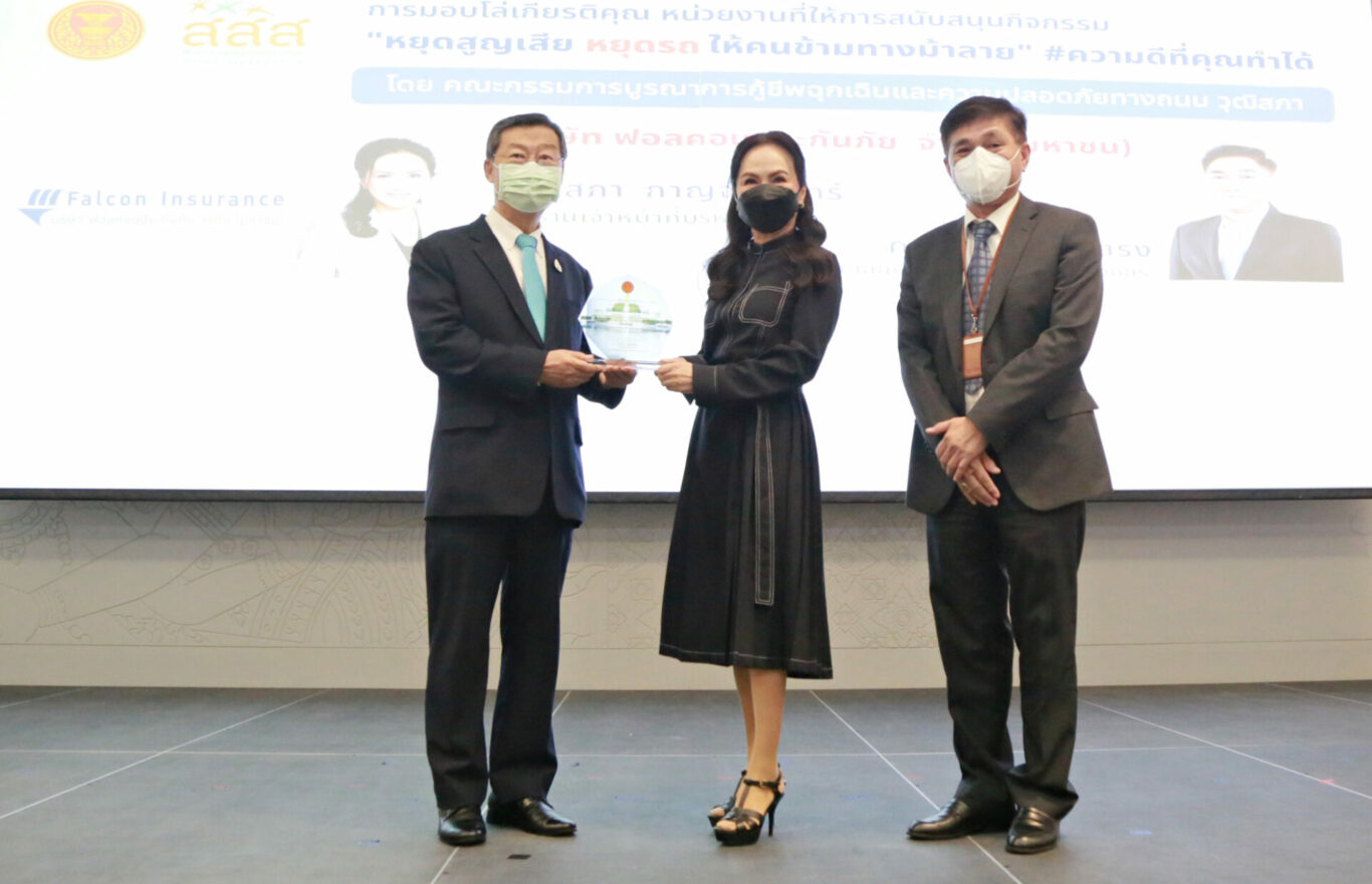 บริษัท ฟอลคอนประกันภัย จำกัด (มหาชน) โดยนางโสภา กาญจนรินทร์ กรรมการและประธานเจ้าหน้าที่บริหาร พร้อมด้วยนายอำนาจ มาตรง ที่ปรึกษาฝ่ายกฎหมายและกำกับดูแลองค์กร เป็นตัวแทนบริษัทฯ รับมอบโล่เกียรติคุณในฐานะเป็นหน่วยงานที่ให้การสนับสนุนการจัดกิจกรรม “หยุดสูญเสีย หยุดรถ ให้คนข้ามทางม้าลาย #ความดีที่คุณทําได้” โดยมีนายสุรชัย เลี้ยงบุญเลิศชัย สมาชิกวุฒิสภา และประธานคณะกรรมการบูรณาการกู้ชีพฉุกเฉินและความปลอดภัยทางถนน วุฒิสภา ในฐานะประธานในพิธีเป็นผู้มอบ