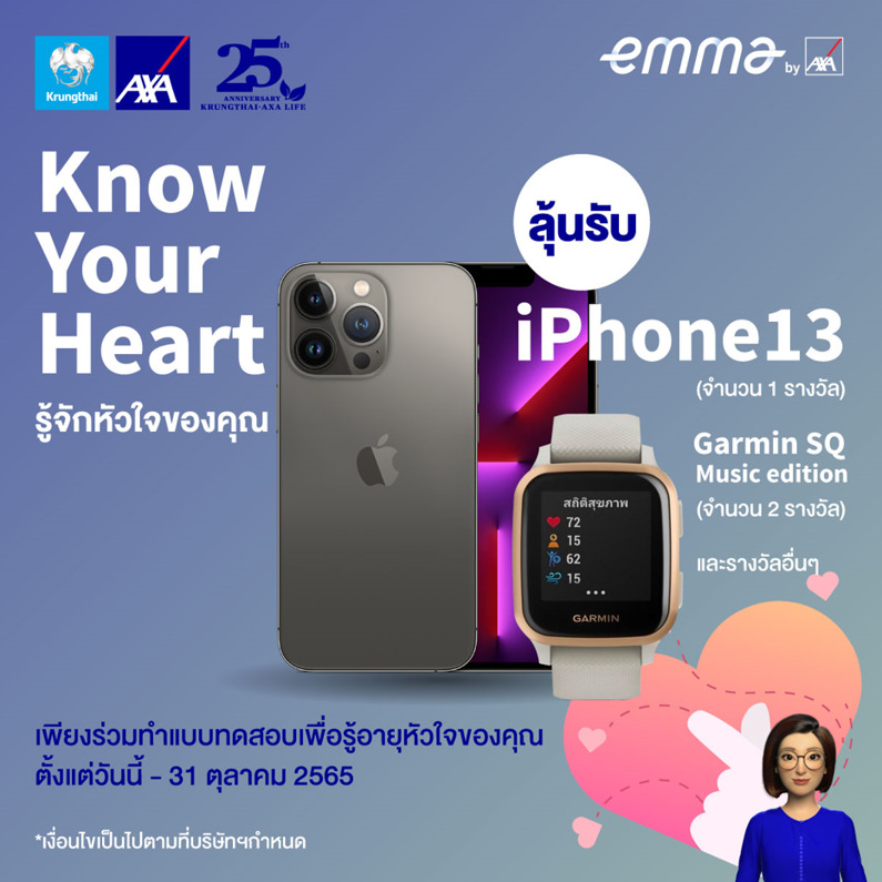 บมจ.กรุงไทย-แอกซ่า ประกันชีวิต ขอเชิญทุกท่านร่วมสนุกกับกิจกรรมพิเศษ “Know Your Heart รู้จักหัวใจของคุณ” บริการด้านสุขภาพรูปแบบใหม่ที่จะช่วยทดสอบอายุหัวใจเมื่อเทียบกับอายุจริง ซึ่งเป็นอีกหนึ่งกิจกรรมที่ช่วยสร้างการตระหนักรู้ในการดูแลสุขภาพของทุกคนรวมถึงลูกค้าคนสำคัญของบริษัทฯ โดยทุกท่านสามารถร่วมสนุกกิจกรรมได้ง่ายๆ เพียงทำแบบทดสอบเพื่อรู้อายุหัวใจของคุณ พร้อมลงทะเบียนที่ https://www.krungthai-axa.co.th/th/know-your-heart เพื่อมีสิทธิลุ้นรับ iPhone13 จำนวน 1 รางวัล Garmin SQ Music Edition จำนวน 2 รางวัล และรางวัลอื่นๆ อีกมากมาย โดยท่านสามารถร่วมกิจกรรมได้ตั้งแต่วันนี้ – 31 ตุลาคม 2565