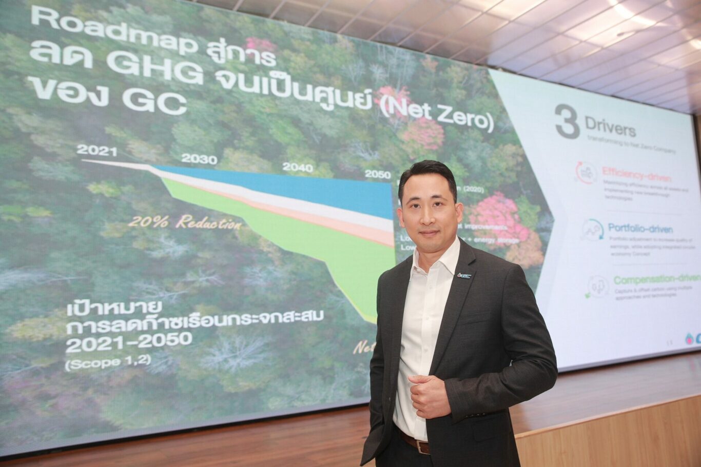 และหนึ่งในบริษัทชั้นนำของประเทศไทยที่มุ่งผลักดันเรื่อง Net Zero อย่างจริงจัง คือ บริษัท พีทีที โกลบอล เคมิคอล จำกัด (มหาชน) หรือ GC โดย ดร.ชญาน์ จันทวสุ รองกรรมการผู้จัดการใหญ่ สายงานความยั่งยืนองค์กร กล่าวว่า “ด้วยบทบาทของผู้นำธุรกิจเคมีภัณฑ์ระดับสากล GC สานต่อการนำแนวคิดเศรษฐกิจหมุนเวียนมาปรับใช้ในการดำเนินธุรกิจ มุ่งสู่ เป้าหมายลดการปล่อยก๊าซเรือนกระจกสุทธิเป็นศูนย์ (Net Zero) ภายในปี 2593 และเราให้ความสำคัญกับการเพิ่มประสิทธิภาพในการดำเนินงานของธุรกิจเดิม เพื่อลดผลกระทบต่อสิ่งแวดล้อม ในขณะเดียวกันก็ได้ปรับโครงสร้างของธุรกิจ ด้วยการลงทุนในธุรกิจใหม่ ซึ่งเน้นการพัฒนานวัตกรรมที่เป็นมิตรต่อสิ่งแวดล้อม ยกระดับคุณภาพชีวิต ตอบโจทย์ความต้องการของผู้บริโภคยุคใหม่ เช่น พลาสติกชีวภาพ พลาสติก รีไซเคิลคุณภาพสูง และเคมีภัณฑ์ที่มีมูลค่าสูง จากการเข้าซื้อกิจการ allnex ผู้นำระดับโลกในธุรกิจผลิตภัณฑ์สารเคลือบผิว (Coating Resins) และสารเติมแต่งสำหรับงานอุตสาหกรรมที่มีความหลากหลายสำหรับใช้กับวัสดุ ทุกประเภท เป็นต้น ทั้งนี้ GC คาดว่าจะใช้เงินลงทุนเพื่อลดการปล่อยก๊าซเรือนกระจกลง 5 พันล้านเหรียญสหรัฐ และ 2.2 หมื่นล้านเหรียญสหรัฐ เพื่อปรับโครงสร้างธุรกิจเข้าสู่ธุรกิจคาร์บอนต่ำเพื่อการบรรลุเป้าหมาย Net Zero ควบคู่ไปกับการเติบโตของธุรกิจอย่างยั่งยืนในระยะยาว โดยผลการดำเนินงานที่ผ่านมาชี้ให้เห็นว่า ความสำเร็จของกลยุทธ์ด้านความยั่งยืนสามารถสร้างผลตอบแทนในเชิงธุรกิจได้อย่างเป็นรูปธรรม”