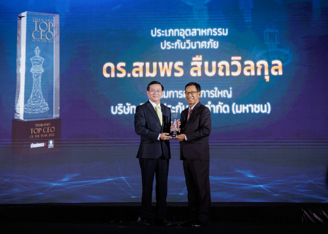 ดร.สมพร สืบถวิลกุล กรรมการผู้จัดการใหญ่ บมจ.ทิพยประกันภัย เข้ารับรางวัล THAILAND TOP CEO OF THE YEAR 2022 ประเภทอุตสาหกรรมประกันวินาศภัย จาก ฯพณฯ นุรักษ์ มาประณีต องคมนตรี มาเป็นประธานในพิธีมอบรางวัล “THAILAND TOP CEO OF THE YEAR 2022”