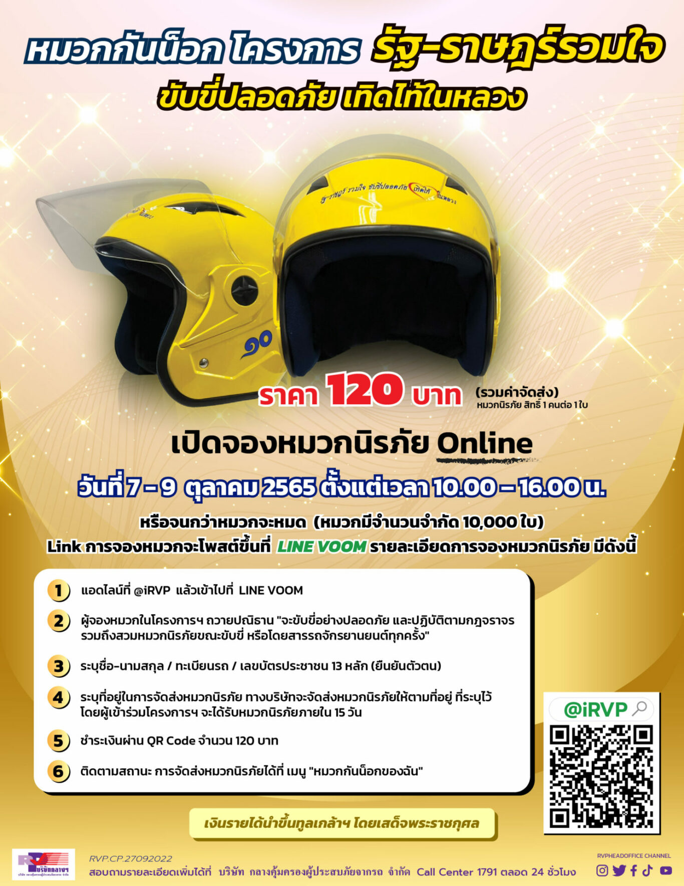 1.จองแบบ Online ผ่านไลน์ @iRVP (ราคา 120 บาท) (รวมค่าจัดส่ง) เริ่มตั้งแต่เวลา 10.00 ถึง 16.00 น. หรือจนกว่าหมวกจะหมด (หมวกมีจำนวนจำกัด) เพียงแค่แอดไลน์เป็นเพื่อนกับบริษัทกลางฯ ที่ไลน์ @iRVP ได้ตั้งแต่วันนี้เป็นต้นไป โดยวันที่ 7-9 ตุลาคม2565 บริษัทกลางฯ จะใส่ลิงค์จองหมวกไว้ที่หน้าไทม์ไลน์ (Line Voom) โดยท่านที่สนใจสามารถจองหมวกนิรภัยได้ 1 คนต่อ 1 ใบ ขั้นตอนการจองหมวกนิรภัยในโครงการ