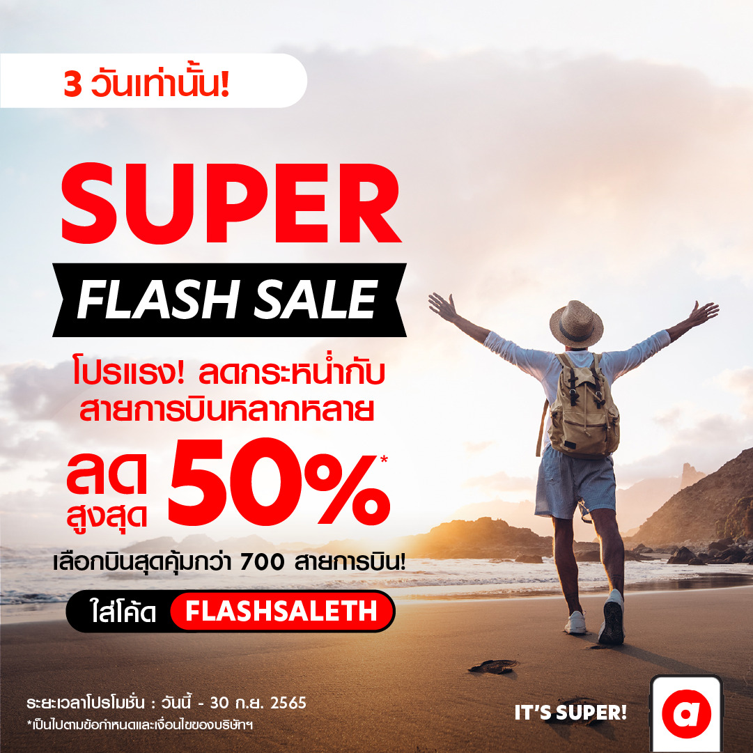 แคมเปญ “Super Flash Sale” จาก airasia Super App พร้อมมอบส่วนลดโปรโมชั่นตั๋วเครื่องบินหลากหลายเส้นทาง จากกว่า 700 สายการบิน เมื่อจองผ่านแอปพลิเคชั่นในราคาพิเศษลดสูงสุดถึง 50% หรือสูงสุดไม่เกิน 1,620 บาท โดยไม่มียอดจองขั้นต่ำ เพียงแค่ใส่รหัสโปรโมชั่น ”FLASHSALETH” อย่ารอช้ารีบจอง วันที่ 28-30 กันยายน 2565 นี้เท่านั้น โดยเดินทางได้ตั้งแต่ระหว่างวันที่ 28 กันยายน 2565 ถึง 30 มิถุนายน 2566