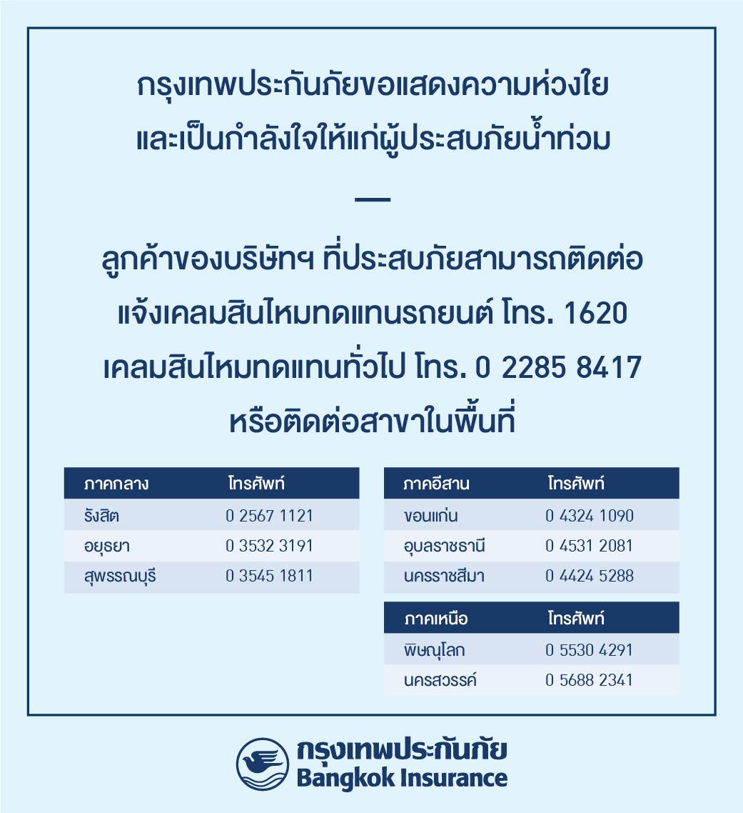 จากสถานการณ์อุทกภัยหลายจังหวัดที่ประสบอยู่และเตรียมรับมือกับอุทกภัยที่จะเกิดขึ้น บริษัท กรุงเทพประกันภัย จำกัด (มหาชน) หรือ BKI ขอแสดงความห่วงใยและเป็นกำลังใจให้แก่ผู้ประสบภัย และเพื่ออำนวยความสะดวกให้แก่ลูกค้าที่ประสบภัยน้ำท่วม บริษัทฯ พร้อมให้คำปรึกษา และสามารถติดต่อแจ้งเคลมสินไหมทดแทนได้ ดังนี้