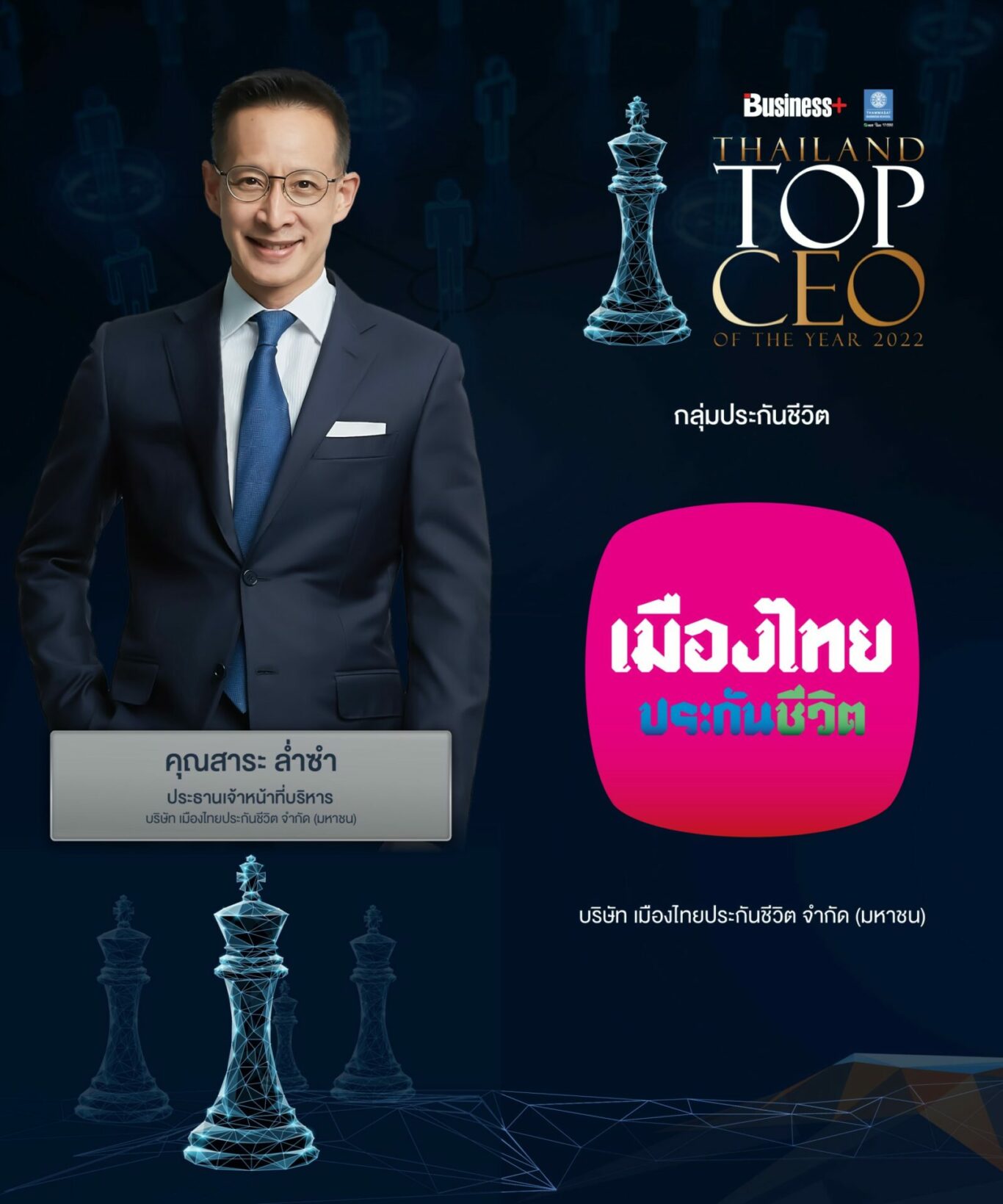 นายสาระ ล่ำซำ ประธานเจ้าหน้าที่บริหาร บริษัท เมืองไทยประกันชีวิต จำกัด (มหาชน) รับรางวัลสุดยอดผู้บริหารองค์กร “THAILAND TOP CEO OF THE YEAR 2022” ประเภท “อุตสาหกรรมประกันชีวิต” โดยได้รับเกียรติจาก ฯพณฯ นุรักษ์ มาประณีต องคมนตรี เป็นประธานในพิธีมอบรางวัลดังกล่าว