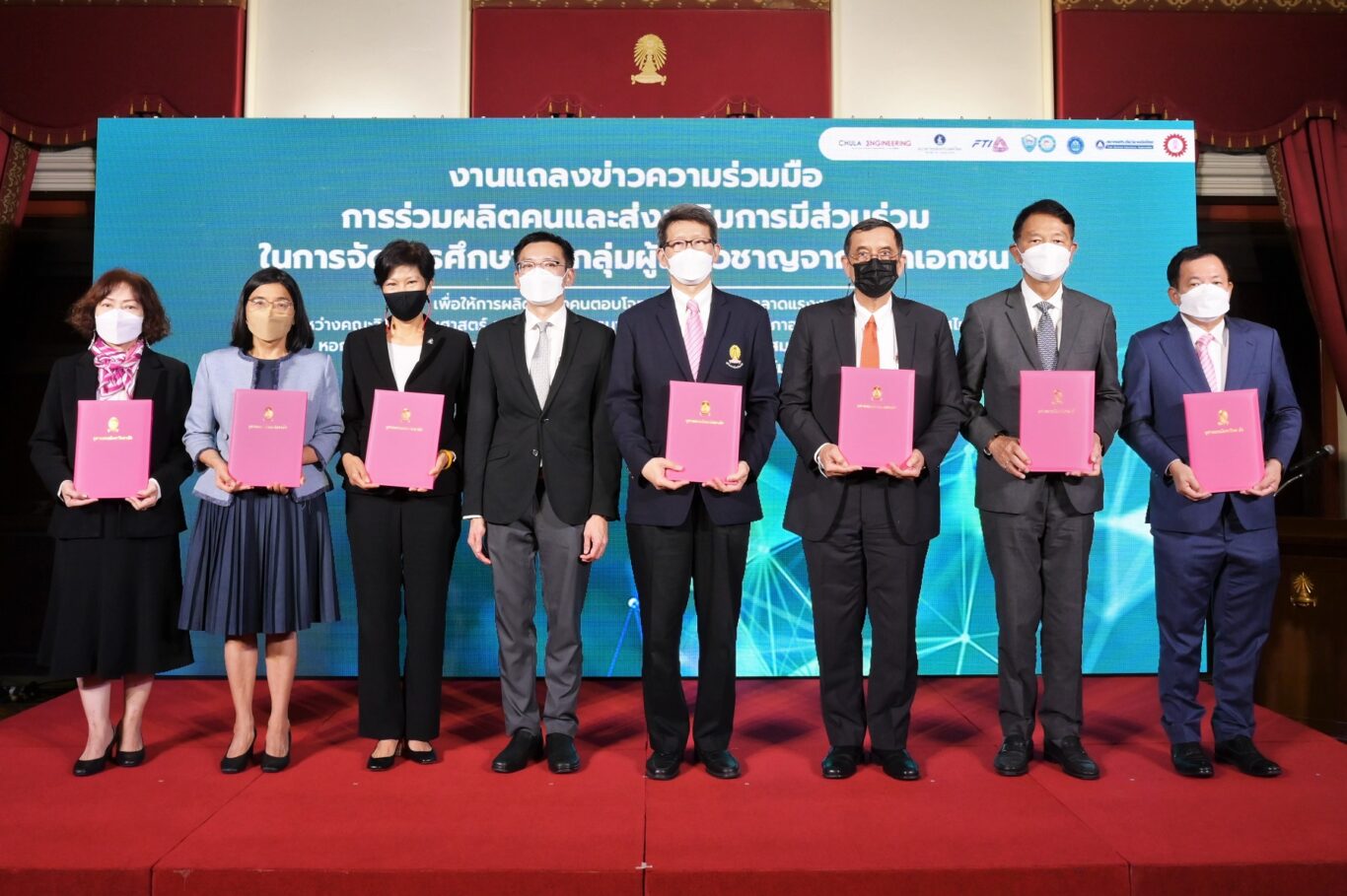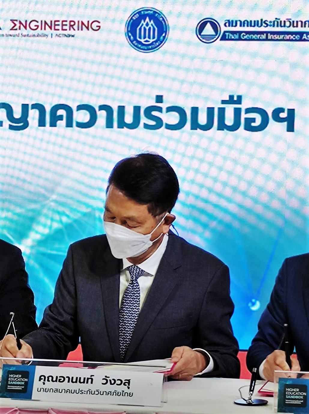นายอานนท์ วังวสุ นายกสมาคมประกันวินาศภัยไทย ร่วมลงนามปฏิญญาความร่วมมือในการร่วมผลิตกำลังคนและส่งเสริมการมีส่วนร่วมในการจัดการศึกษาของกลุ่มผู้เชี่ยวชาญจากภาคเอกชน เพื่อให้การผลิตกำลังคนตอบโจทย์ความต้องการของตลาดแรงงานภายใต้ข้อเสนอการจัดการศึกษาที่แตกต่างจากมาตรฐานการอุดมศึกษา (Higher Education Sandbox) ระหว่าง คณะวิศวกรรมศาสตร์ จุฬาลงกรณ์มหาวิทยาลัย ร่วมกับ ธนาคารแห่งประเทศไทย สภาอุตสาหกรรมแห่งประเทศไทย หอการค้าไทย และ สภาหอการค้าแห่งประเทศไทย สมาคมธนาคารไทย และ สมาคมนิสิตเก่าวิศวกรรรมศาสตร์แห่งจุฬาลงกรณ์มหาวิทยาลัย ณ ห้อง 111 อาคารมหาจุฬาลงกรณ์ จุฬาลงกรณ์มหาวิทยาลัย