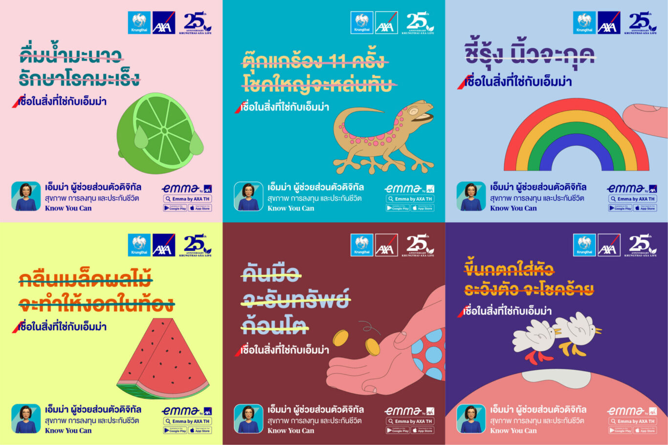 บมจ.กรุงไทย-แอกซ่า ประกันชีวิต ผู้นำธุรกิจประกันชีวิตและสุขภาพ ส่งแคมเปญโฆษณาออนไลน์ชุดใหม่ “เชื่อในสิ่งที่ใช่กับเอ็มม่า” ซึ่งเป็นการนำเรื่องราวความเชื่อเก่าแก่ ตำนานโบราณ และสิ่งที่คนส่วนใหญ่ยังถือปฏิบัติต่อๆ กันมา พร้อมนำเสนอ Emma by AXA ที่เป็นผู้รู้จริง และสามารถให้คำแนะนำที่ถูกต้องแก่ทุกคน โดยแคมเปญดังกล่าว ประกอบด้วย โฆษณาออนไลน์ ถ่ายทอดผ่านตัวละครมีความเชื่อ ที่ถูกส่งต่อกันมาอย่างยาวนาน แต่เป็นความเชื่อแบบผิดๆ ซึ่งโชคดีที่ ตัวละครนี้ได้พบความจริง โดย Emma by AXA ผู้ช่วยส่วนตัวดิจิทัล จากกรุงไทย-แอกซ่า ประกันชีวิต ที่ช่วยแนะนำข้อมูลที่ถูกต้องและแม่นยำ ซึ่งโฆษณาชุดนี้ได้รับเกียรติจาก คุณหญิง-รฐา โพธิ์งาม พรีเซนเตอร์ Emma มาถ่ายทอดเรื่องราว และสื่อภาพนิ่ง ออกแบบโดยศิลปินคุณคามิโล ฮุนก้า (Camilo Huinca) ศิลปินกราฟิกชื่อดัง ที่ออกแบบลายเส้นสุดพิเศษที่มีเอกลักษณ์เฉพาะตัว เชื่อมโยงเรื่องราวความเชื่อผ่านศิลปะให้เข้าใจได้ง่าย ในแบบต่างๆ อาทิ ดื่มน้ำมะนาวรักษาโรคมะเร็ง เป็นต้น โดยสื่อโฆษณาจะเริ่มสื่อสารในวันที่ 1 ตุลาคม เป็นต้นไป