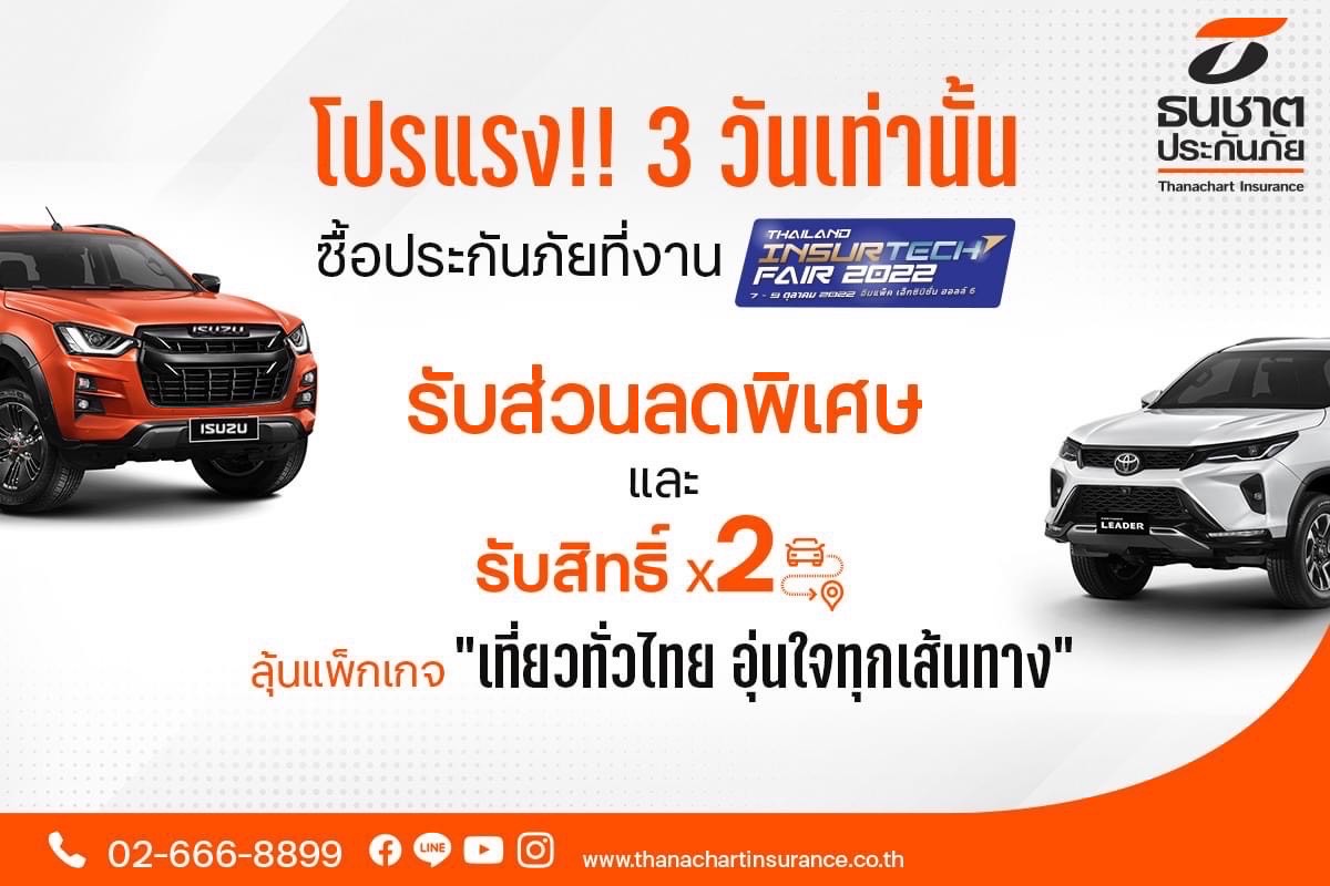 นอกจากนี้ ธนชาตประกันภัย ยังมีกิจกรรมดีๆ พร้อมสิทธิประโยชน์มากมายที่คัดสรรมาให้กับลูกค้าและผู้เยี่ยมชมบูธได้ร่วมสนุกตลอดการจัดงาน ที่สำคัญยังได้จัดทีมขายระดับมืออาชีพคอยให้คำปรึกษาด้านประกันภัย เพื่อให้ลูกค้าได้รับข้อเสนอความคุ้มครองที่ดีที่สุด โดยราคาและส่วนลด พร้อมโปรโมชันพิเศษนี้ มีเฉพาะในงานนี้เท่านั้น ผู้ที่สนใจพบกันได้ที่ บูธธนชาตประกันภัย ในงาน Thailand InsurTech Fair 2022 ณ อิมแพ็คเมืองทองธานี ฮอลล์ 6 หรือสอบถามรายละเอียดเพิ่มเติมได้ที่ โทร. 02-666-8899 ติดตามทุกข่าวสารและกิจกรรมดี ๆ ได้ที่เฟซบุ๊กธนชาตประกันภัย Thanachartinsurance – TNI
