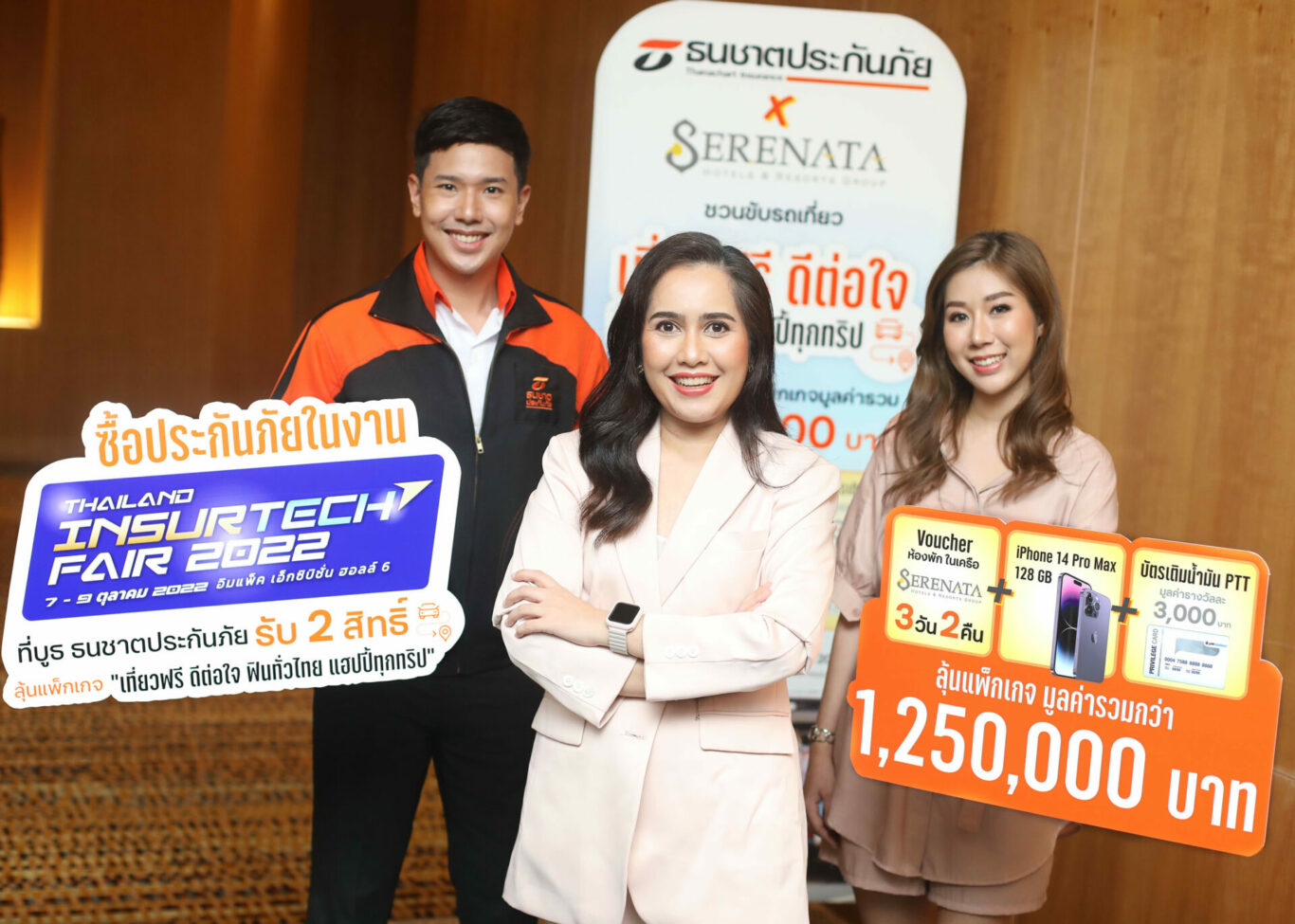 พร้อมยังจัดเต็มกับโปรโมชันที่ดีที่สุดส่งท้ายปลายปี กับแคมเปญ “เที่ยวฟรี ดีต่อใจ” ฟินฟรี 3 ต่อ แฮปปี้ทุกทริปทั่วไทย ให้ได้ลุ้นรางวัล “แพ็กเกจเที่ยวทั่วไทย อุ่นใจทุกเส้นทาง” เพื่อเติมเต็มความสุข อุ่นใจกับความคุ้มครองและบริการจากธนชาตประกันภัยที่พร้อมดูแลตลอด 24 ชั่วโมงในทุกเส้นทาง ด้วย Voucher ห้องพักสุดหรูในเครือ SERENATA 3 วัน 2 คืน และยังมีบัตรเติมน้ำมัน มูลค่า 3,000 บาท พร้อม iPhone 14 Pro max 128 MB รวม 20 รางวัล มูลค่ารวมกว่า 1.2 ล้านบาท ซึ่งสนับสนุนของรางวัลโดยโรงแรมและรีสอร์ทในกลุ่ม SERENATA Hotels & Resorts Group เพียงซื้อกรมธรรม์ใหม่หรือต่ออายุภายในงาน ทุกกรมธรรม์ที่มีค่าเบี้ยตั้งแต่ 3,000 บาท ขึ้นไป จะได้รับถึง 2 สิทธิ์เพื่อลุ้นรางวัลนี้ พร้อมยังมีสิทธิ์ลุ้นชิงรางวัลใหญ่อื่นๆ อีกมากมายภายในงานอีกด้วย