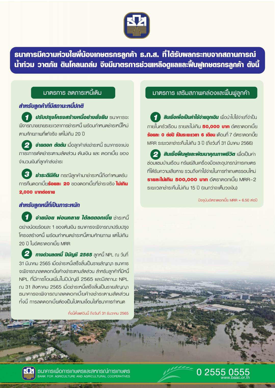 นายธนารัตน์ งามวลัยรัตน์ ผู้จัดการธนาคารเพื่อการเกษตรและสหกรณ์การเกษตร (ธ.ก.ส.) เปิดเผยว่า จากสถานการณ์อุทกภัยที่สร้างความเสียหายต่อทรัพย์สินและพื้นที่การเกษตรและผลกระทบจากสภาวะเศรษฐกิจชะลอตัวที่เกิดขึ้น ส่งผลกระทบต่อความเป็นอยู่ของเกษตรกร ทั้งด้านการใช้ชีวิตและการประกอบอาชีพ เพื่อบรรเทาความเดือดร้อนดังกล่าว ธ.ก.ส. ได้จัดมาตรการลดภาระหนี้เดิม สำหรับลูกค้าที่มีสถานะหนี้ปกติผ่านมาตรการ 1) การปรับปรุงโครงสร้างหนี้อย่างยั่งยืน ธนาคารจะพิจารณาขยายระยะเวลาการชำระหนี้พร้อมกำหนดชำระหนี้ใหม่ตามศักยภาพที่แท้จริง แต่ไม่เกิน 20 ปี 2) จ่ายดอก ตัดต้น เมื่อลูกค้าส่งชำระหนี้ ธนาคารจะแบ่งภาระการตัดชำระหนี้ตามสัดส่วนต้นเงินและดอกเบี้ยของจำนวนเงินที่ลูกค้าส่งชำระ 3) ชำระดีมีคืน กรณีลูกค้ามาชำระหนี้ถึงกำหนด จะได้รับการคืนดอกเบี้ยร้อยละ 20 ของดอกเบี้ยที่ชำระจริงไม่เกิน 2,000 บาทต่อราย เพื่อช่วยเหลือและบรรเทาภาระทางการเงินแก่ลูกค้า ทั้งนี้ ตั้งแต่บัดนี้ถึง 31 ธันวาคม 2565