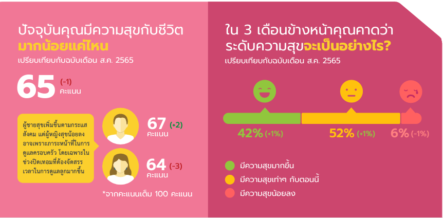 แต่เมื่อลงลึกถึงความสุขในภาพรวมคนไทยมีเกณฑ์ความสุขที่ลดลงเมื่อเทียบจากผลสำรวจเมื่อเดือนสิงหาคมที่ผ่านมา หากแยกเพศจะเห็นได้ชัดว่า ใน 100 คน เพศชายมีเกณฑ์ความสุขที่เพิ่มขึ้น +2 แต่ในเพศหญิงมีเกณฑ์ความสุขที่ลดลง -3 อันส่งผลมาจากภาระหน้าที่ในการทำงาน ทั้งงานในบ้าน งานนอกบ้าน รวมถึงการต้องดูแลเด็กๆ ในช่วงปิดเทอม ทำให้ไม่มีเวลามากพอในการพักผ่อน ซึ่งนี่เป็นอีกหนึ่งเหตุผลสำคัญที่ทำให้แนวโน้มเรื่องความสุขโดยรวมลดลง