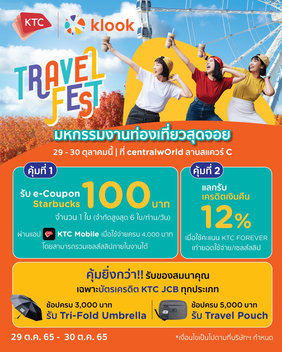 “เคทีซี” หรือ บริษัท บัตรกรุงไทย จำกัด (มหาชน) จัดโปรโมชันพิเศษเอาใจสมาชิกบัตรฯ ที่ชื่นชอบการเดินทาง ในงาน “Klook Travel Festival 2022” ที่รวบรวมดีลด้านการเดินทางท่องเที่ยวไว้มากมายทั้งในประเทศและต่างประเทศ ภายในงานสมาชิกบัตรเครดิตเคทีซีรับสิทธิพิเศษสุดคุ้ม 2 ต่อ ดังนี้