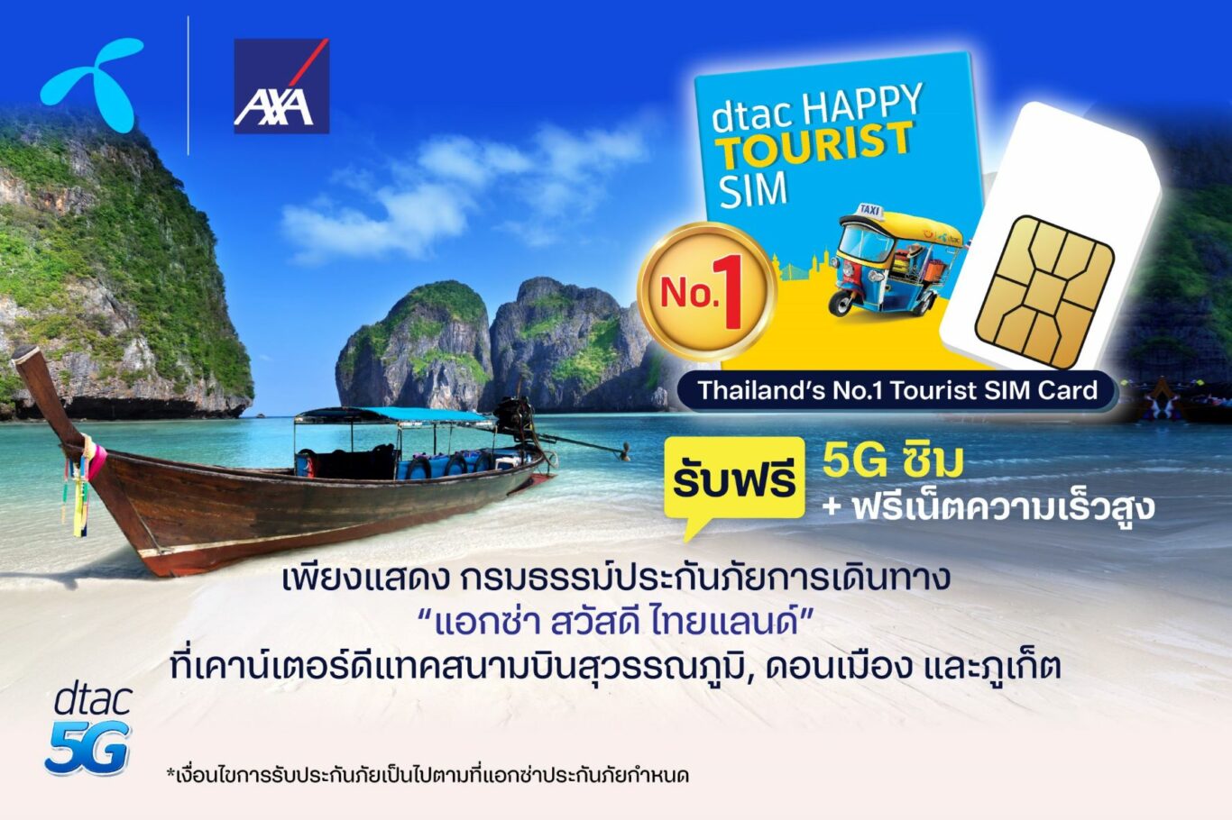 ลูกค้าแอกซ่าสามารถรับซิมดีแทค เพียงโชว์หน้าตากรมธรรม์ “แอกซ่า สวัสดี ไทยแลนด์” ที่ดีแทคเคาน์เตอร์ที่สนามบินสุวรรณภูมิ สนามบินดอนเมือง และสนามบินภูเก็ต ตั้งแต่วันนี้ถึงวันที่ 31 ธันวาคม 2565