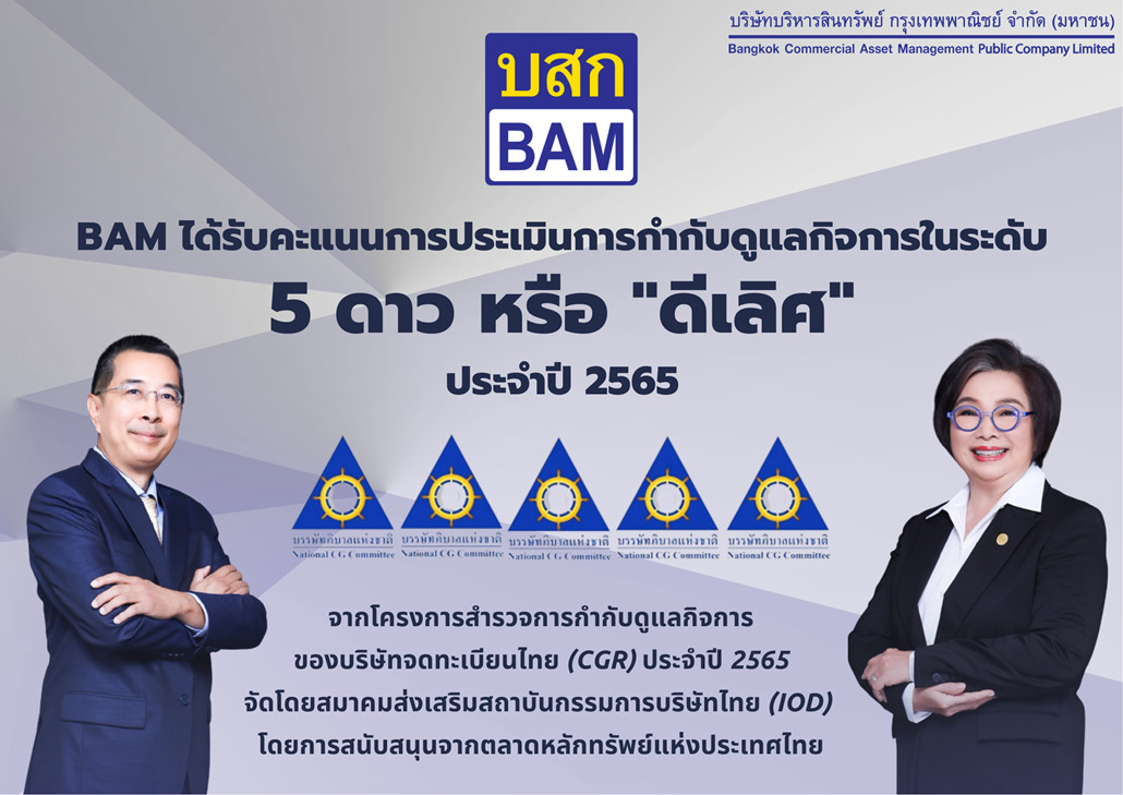 บริษัทบริหารสินทรัพย์ กรุงเทพพาณิชย์ จำกัด (มหาชน) หรือ “BAM” ตอกย้ำความสำเร็จในการดำเนินธุรกิจอย่างมีธรรมาภิบาลและยั่งยืนอย่างต่อเนื่อง โดยในปี 2565 นอกจาก BAM จะได้รับการคัดเลือกให้อยู่ในรายชื่อหุ้นยั่งยืน (THSI) เป็นปีแรก ซึ่งถือเป็นก้าวสำคัญสู่การเป็นบริษัทบริหารสินทรัพย์ที่ดำเนินธุรกิจภายใต้หลักการ ESG ที่เติบโตอย่างยั่งยืนแล้ว เมื่อวันที่ 27 ตุลาคม 2565 BAM ยังได้รับการประเมินการกำกับดูแลกิจการในโครงการสำรวจการกำกับดูแลกิจการบริษัทจดทะเบียนไทย (CGR) อยู่ในระดับ 5 ดาว หรือ “ดีเลิศ” จาก สมาคมส่งเสริมสถาบันกรรมการบริษัทไทย (IOD) โดยการสนับสนุนจากตลาดหลักทรัพย์แห่งประเทศไทย (ตลท.) ด้วย