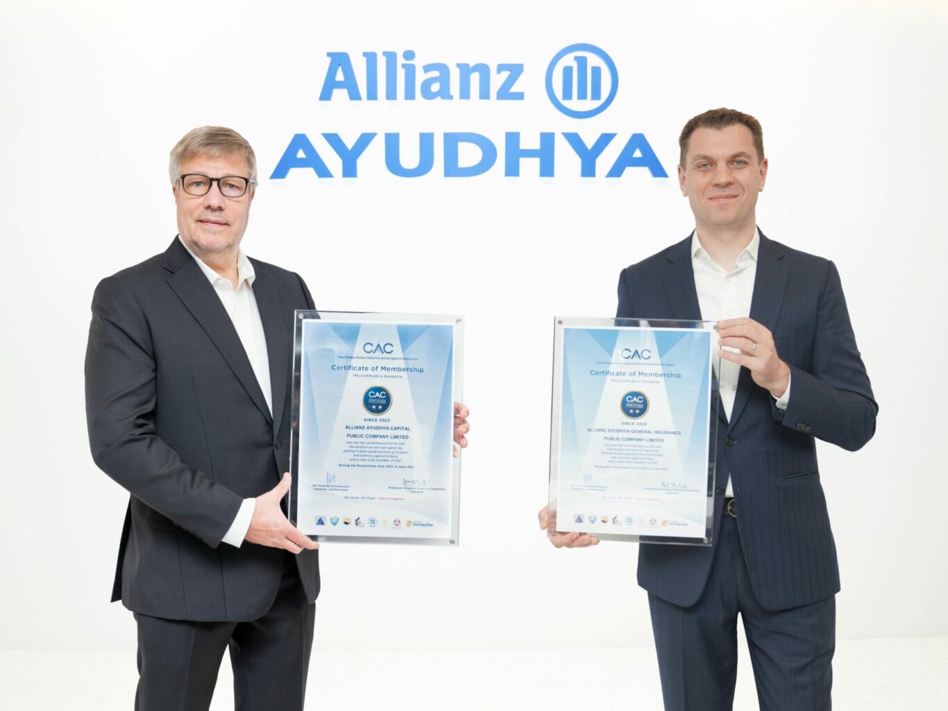 มร.โทมัส วิลสัน (ซ้าย) กรรมการผู้จัดการใหญ่และประธานเจ้าหน้าที่บริหาร บมจ. อลิอันซ์ อยุธยา ประกันชีวิต และมร.ลาร์ส ไฮบุทสกี้ (ขวา) กรรมการผู้จัดการใหญ่และประธานเจ้าหน้าที่บริหาร บมจ. อลิอันซ์ อยุธยา ประกันภัย เข้ารับมอบประกาศนียบัตร ในโอกาสที่ บมจ. อลิอันซ์ อยุธยา แคปปิตอล และ บมจ. อลิอันซ์ อยุธยา ประกันภัย ผ่านการรับรองเป็นสมาชิกแนวร่วมต่อต้านคอร์รัปชันของภาคเอกชนไทยในการต่อต้านทุจริตเป็นครั้งที่สามหลังจากได้รับการรับรองครั้งแรกเมื่อปี 2016 ภายใต้โครงการ Thai Private Sector Collective Action Against Corruption หรือ CAC โดยเป็นความริเริ่มของภาคเอกชนไทยในการมีส่วนร่วมในการแก้ไขปัญหาการทุจริตคอร์รัปชัน ด้วยการส่งเสริมให้บริษัทต่างๆ กำหนดนโยบายและแนวปฏิบัติในการปฏิเสธการรับและจ่ายสินบน รวมถึงการทุจริตคอร์รัปชั่นในทุกรูปแบบ