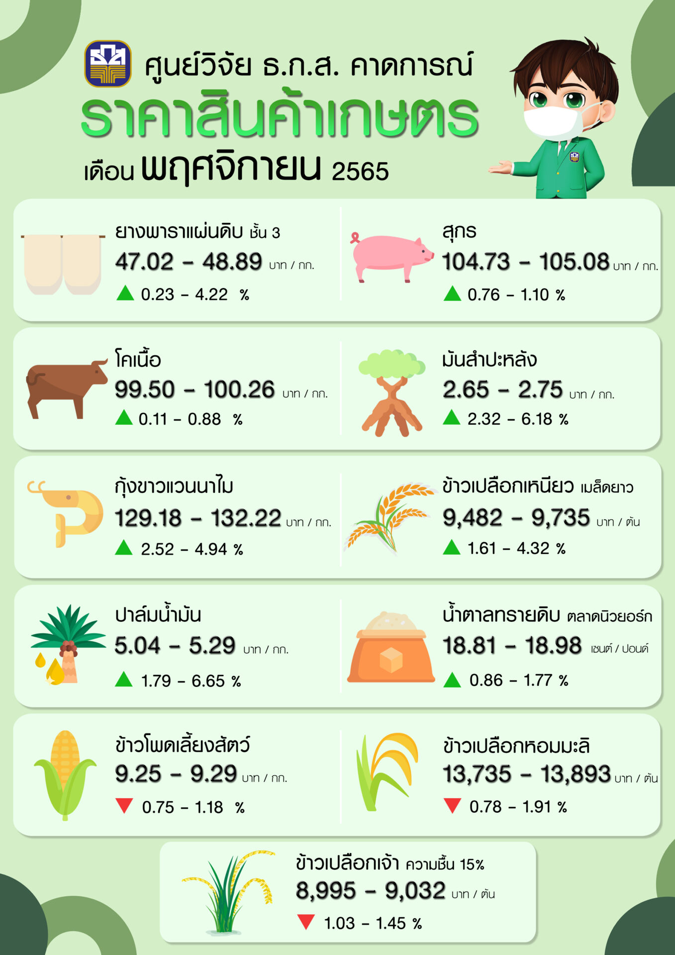ศูนย์วิจัยและพัฒนานวัตกรรม ธ.ก.ส. เผยราคาสินค้าเกษตรในเดือนพฤศจิกายน 2565 มีแนวโน้มปรับตัวสูงขึ้น เนื่องจากภัยธรรมชาติ ภาวะเงินบาทอ่อนค่าและช่วงฤดูกาลท่องเที่ยว ส่งผลให้ราคาสินค้าเกษตรปรับตัวเพิ่มขึ้น ได้แก่ ข้าวเปลือกเหนียวเมล็ดยาว น้ำตาลทรายดิบ ยางพาราแผ่นดิบ มันสำปะหลัง ปาล์มน้ำมัน สุกร กุ้งขาวแวนนาไมและโคเนื้อ ส่วนสินค้าเกษตรที่มีราคาลดลง ได้แก่ ข้าวเปลือกเจ้าความชื้น 15% ข้าวเปลือกเจ้าหอมมะลิ และข้าวโพดเลี้ยงสัตว์