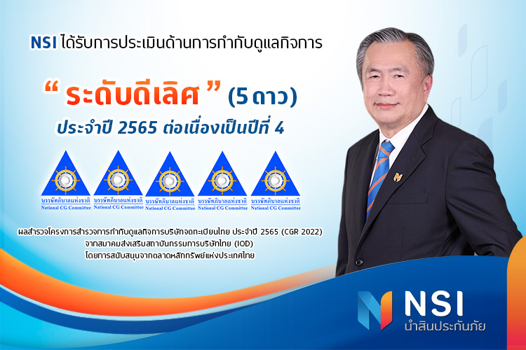 บริษัท นำสินประกันภัย จำกัด (มหาชน) หรือ NSI ได้รับคะแนนประเมินด้านการกำกับดูแลกิจการที่ดี ในระดับ 5 ดาว “ดีเลิศ” (Excellent CG Scoring) ประจำปี 2565 ติดต่อกันเป็นปีที่ 4 ในโครงการสำรวจการกำกับดูแลกิจการบริษัทจดทะเบียนไทย ประจำปี 2565 (Corporate Governance Report of Thai Listed Companies 2022 : CGR 2022) จากสมาคมส่งเสริมสถาบันกรรมการบริษัทไทย (IOD) ด้วยการสนับสนุนจากตลาดหลักทรัพย์แห่งประเทศไทย ซึ่งสะท้อนให้เห็นถึงประสิทธิภาพด้านการกำกับดูแลกิจการที่ดีอย่างต่อเนื่อง การให้ความสำคัญกับการดำเนินธุรกิจที่คำนึงถึง ESG โดยมีบรรษัทภิบาลเป็นพื้นฐาน และคำนึงถึงผลประโยน์ของผู้มีส่วนได้เสียทุกกลุ่มเป็นสำคัญ