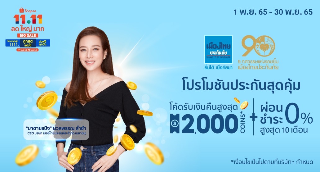 เมืองไทยประกันภัย หรือ MTI ผู้นำด้านการรับประกันวินาศภัยแนวหน้าของประเทศ ที่เพิ่งจัดงานฉลองใหญ่ครบรอบ 90 ปี ส่งแคมเปญโปรโมชันดีลดีประกันภัยสุดคุ้ม ต้อนรับมหกรรม Shopee 11.11 ลด ใหญ่ มาก ในเดือนพฤศจิกายน บนแอปฯ ช้อปปี้ที่เดียว ให้ลูกค้ารับโปรดีลดี แจกเงินคืนสูงสุด 2,000 Shopee Coins พร้อมสิทธิ์ผ่อนชำระเบี้ยประกันภัย 0% นานสูงสุด 10 เดือน ให้ เมืองไทยประกันภัย ช่วยดูแลคุณตั้งแต่วันนี้ จนถึง 30 พ.ย. เท่านั้น บนร้านค้าออฟฟิเชียลสโตร์ Muangthai Insurance Official ใน Shopee Mall