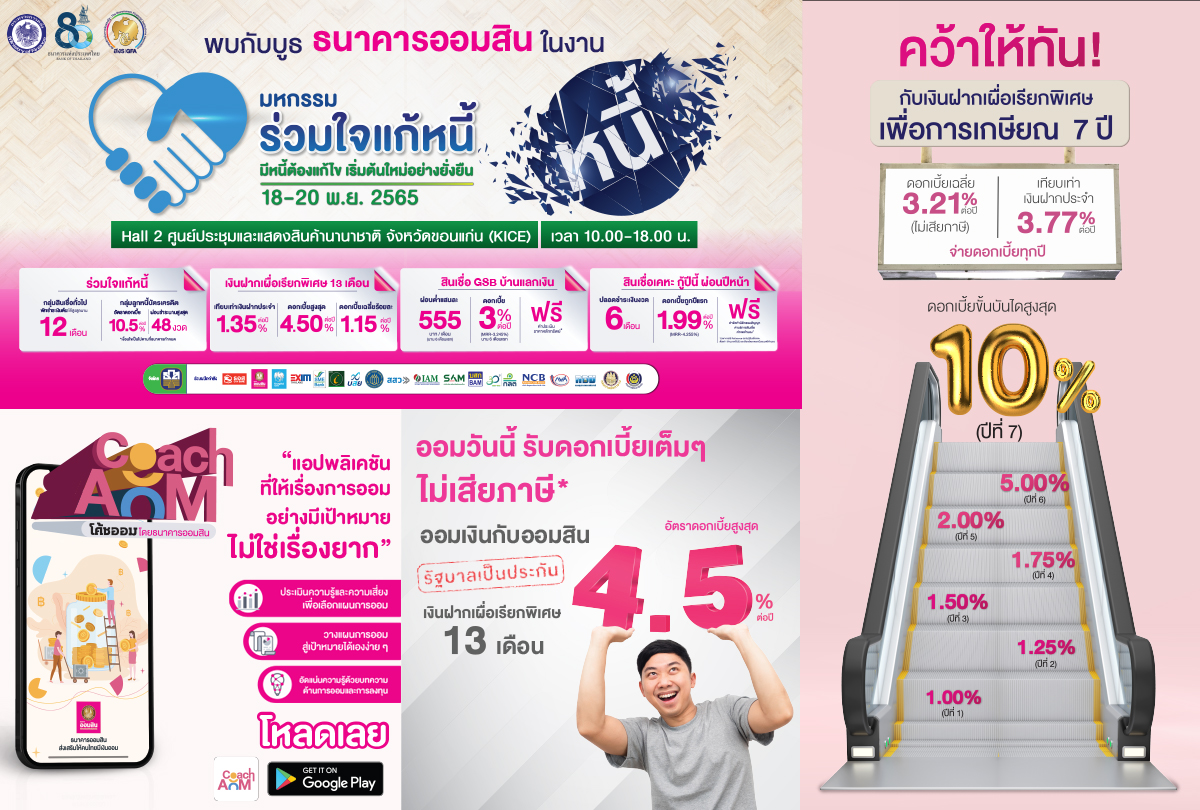 ขอเชิญชวนลูกค้าประชาชนติดต่อพูดคุยเจรจาหนี้ ร่วมกันปลดล็อคให้สถานะหนี้คลายตัวภายใต้สิทธิประโยชน์ที่ธนาคารนำเสนอเป็นพิเศษ รวมทั้งเยี่ยมชม และร่วมกิจกรรมที่บูธธนาคารออมสิน รวมถึงการจัดฝึกอบรมอาชีพ การแสดงและจำหน่ายสินค้าของผู้ประกอบการรายย่อยในโครงการพัฒนาของธนาคารออมสิน ภายในงานมหกรรมร่วมใจแก้หนี้ สัญจร จ.ขอนแก่น ซึ่งจัดขึ้นในวันที่ 18-20 พฤศจิกายน 2565 ณ ฮอลล์ 2 ศูนย์ประชุมและแสดงสินค้านานาชาติ จังหวัดขอนแก่น (KICE) ในเวลา 10.00-18.00 น. ซึ่งมีธนาคารเพื่อการเกษตรและสหกรณ์การเกษตร หรือ ธ.ก.ส. เป็นเจ้าภาพ ทั้งนี้ นอกจากโปรดักส์ไฮไลท์ข้างต้นแล้ว