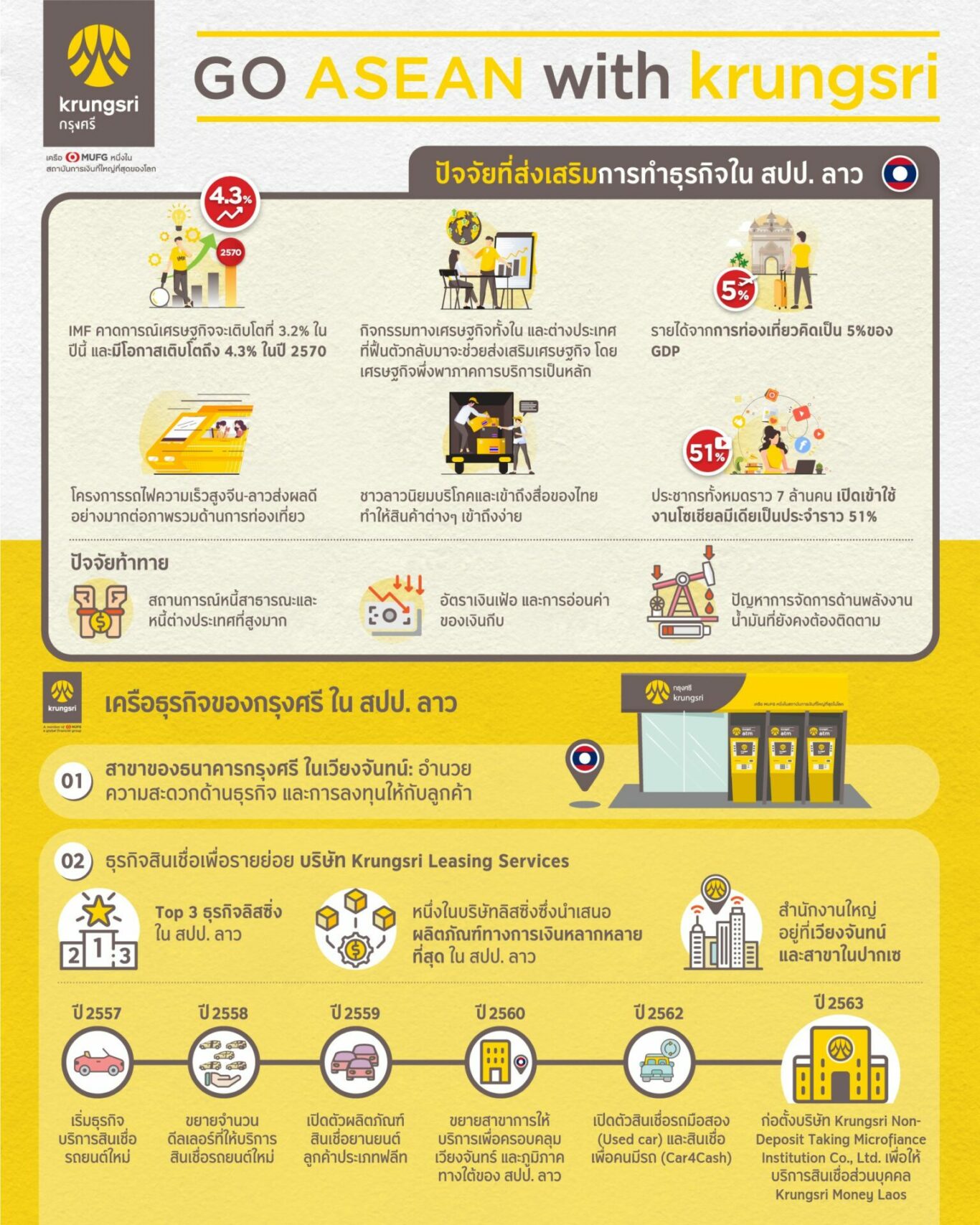 กรุงเทพฯ (22 พฤศจิกายน 2565) – กรุงศรี (ธนาคารกรุงศรีอยุธยา จำกัด (มหาชน)) ในเครือของมิตซูบิชิ ยูเอฟเจ ไฟแนนเชียล กรุ๊ป (MUFG) หนึ่งในกลุ่มสถาบันการเงินที่ใหญ่ที่สุดระดับโลก เดินหน้าผลักดันธุรกิจเพื่อเชื่อมโยงเครือข่ายในภูมิภาคอาเซียน พร้อมชูบริการด้านลีสซิ่งและสินเชื่อเป็นเรือธงบุกตลาดประเทศลาว