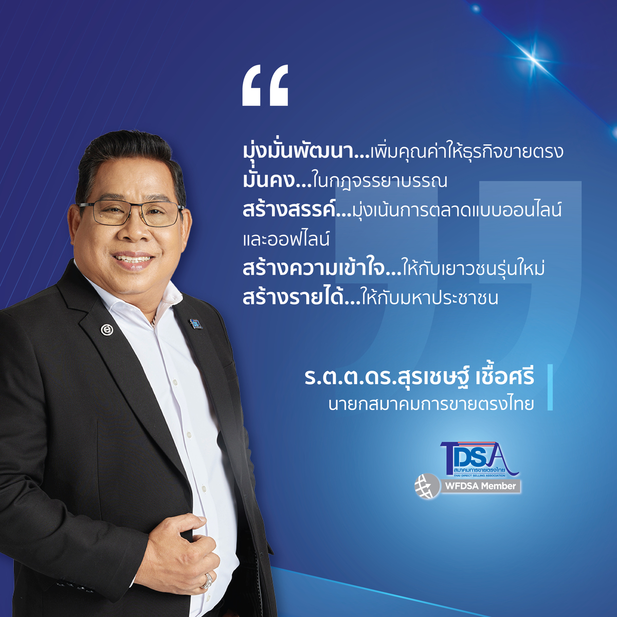 กรุงเทพฯ (23 พฤศจิกายน 2565) สมาคมการขายตรงไทย แต่งตั้ง ร.ต.ต.ดร.สุรเชษฐ์ เชื้อศรี ขึ้นดำรงตำแหน่ง นายกสมาคมการขายตรงไทย พร้อมเปิดตัวคณะกรรมการบริหารงานชุดใหม่ กำหนดนโยบายสานความสัมพันธ์ทุกภาคส่วนที่เกี่ยวข้องเพื่อพัฒนาและเพิ่มศักยภาพธุรกิจขายตรงให้สอดรับกับเทรนด์และความต้องการของผู้บริโภคที่มีการเปลี่ยนแปลงไปตามเศรษฐกิจและกระแสโลก พร้อมกระตุ้นความเชื่อมั่นให้แก่บริษัทสมาชิกและนักธุรกิจอิสระ ภายใต้นโยบายและทิศทางการดำเนินธุรกิจเพื่อส่งเสริมและช่วยเหลือในการขับเคลื่อนอุตสาหกรรมขายตรงไทยให้สามารถเติบโตอย่างมีคุณภาพและยั่งยืนอย่างมีนัย