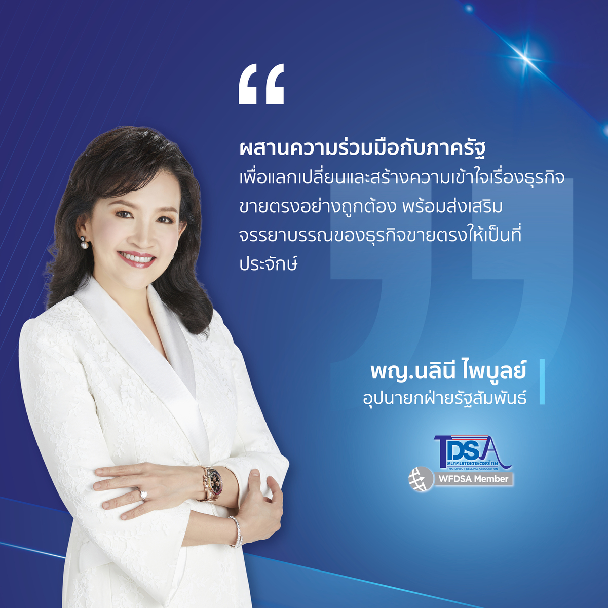 ทั้งนี้ ภาพรวมของธุรกิจขายตรงไทยในปี พ.ศ. 2564 มียอดขายสุทธิประมาณ 63,800 ล้านบาท มีนักธุรกิจอิสระ 11 ล้านคน คาดหมายภาพรวมของธุรกิจขายตรงไทยในปีนี้จะมีแนวโน้มกลับมาดีขึ้น หลังจากผ่านพ้นสถานการณ์วิกฤตและปัจจัยลบทางเศรษฐกิจโลกที่ส่งผลกระทบกับทุกอุตสาหกรรม เห็นได้จากกระแสความสนใจของผู้บริโภคที่หันมาสนใจเรื่องการดูแลสุขภาพและความงาม ซึ่งสอดคล้องกับสัดส่วนยอดขายของธุรกิจขายตรงไทยที่มาจากหมวดผลิตภัณฑ์ Wellness และ Beauty สูงถึง 78% (ที่มา: 2021 WFDSA Global Statistic Survey www.wfdsa.org/global-statistics)