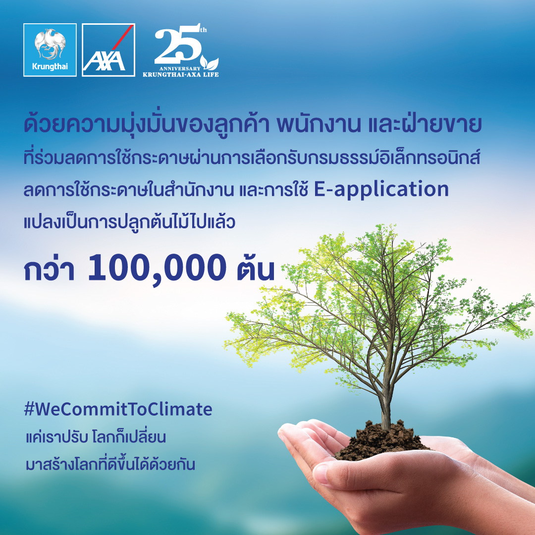 บมจ.กรุงไทย-แอกซ่า ประกันชีวิต ในฐานะองค์กรระดับแนวหน้าที่ให้ความสำคัญต่อสิ่งแวดล้อมและภาวะโลกร้อน หรือ Climate change มุ่งมั่นขับเคลื่อนนโยบายดังกล่าวในฐานะ ‘Green Insurer’ หรือผู้นำบริษัทประกันที่ใส่ใจสิ่งแวดล้อม รวมทั้งส่งเสริมและกระตุ้นการปลูกจิตสำนึก พร้อมสร้างการตระหนักรู้ สนับสนุนการปรับเปลี่ยนพฤติกรรม ผ่านโครงการ ‘Go Green’ โดยปัจจุบันได้ปลูกป่าไปแล้วกว่า 100,000 ต้น ทั่วประเทศไทย สามารถดูดซับก๊าซคาร์บอนไดออกไซด์กว่า 900,000 กิโลกรัม/ปี ซึ่งต้นไม้ที่ปลูกเกิดจากความร่วมมือของทุกภาคส่วน ได้แก่ พนักงาน ฝ่ายขาย และลูกค้า โดยร่วมการลดใช้กระดาษ ซึ่งพนักงานร่วมกันลดการใช้กระดาษทุก 100 แผ่น จะแปลงเป็นการปลูกต้นไม้ 1 ต้น สำหรับฝ่ายขาย ได้เปลี่ยนจากแบบฟอร์มการสมัครประกันแบบกระดาษ เป็นเล็กโทรนิกส์ (E-application) ซึ่งทุก 10 E-application จะเปลี่ยนเป็นการปลูกต้นไม้ 1 ต้น และสุดท้ายสำหรับลูกค้า ที่เลือกรับกรมธรรม์อิเล็กทรอนิกส์ (E-policy) แทนกรมธรรม์กระดาษ ทุก 1 กรมธรรม์จะแปลงเป็นการปลูกต้นไม้ 1 ต้น ซึ่งกิจกรรมดังกล่าวสอดคล้องกับนโยบายของบริษัทฯ ที่มุ่งมั่นอยู่เคียงข้าง คุ้มครอง พร้อมใส่ใจ สิ่งแวดล้อม #WeCommitToClimate แค่เราปรับ โลกก็เปลี่ยน มาสร้างโลกที่ดีขึ้นไปด้วยกัน