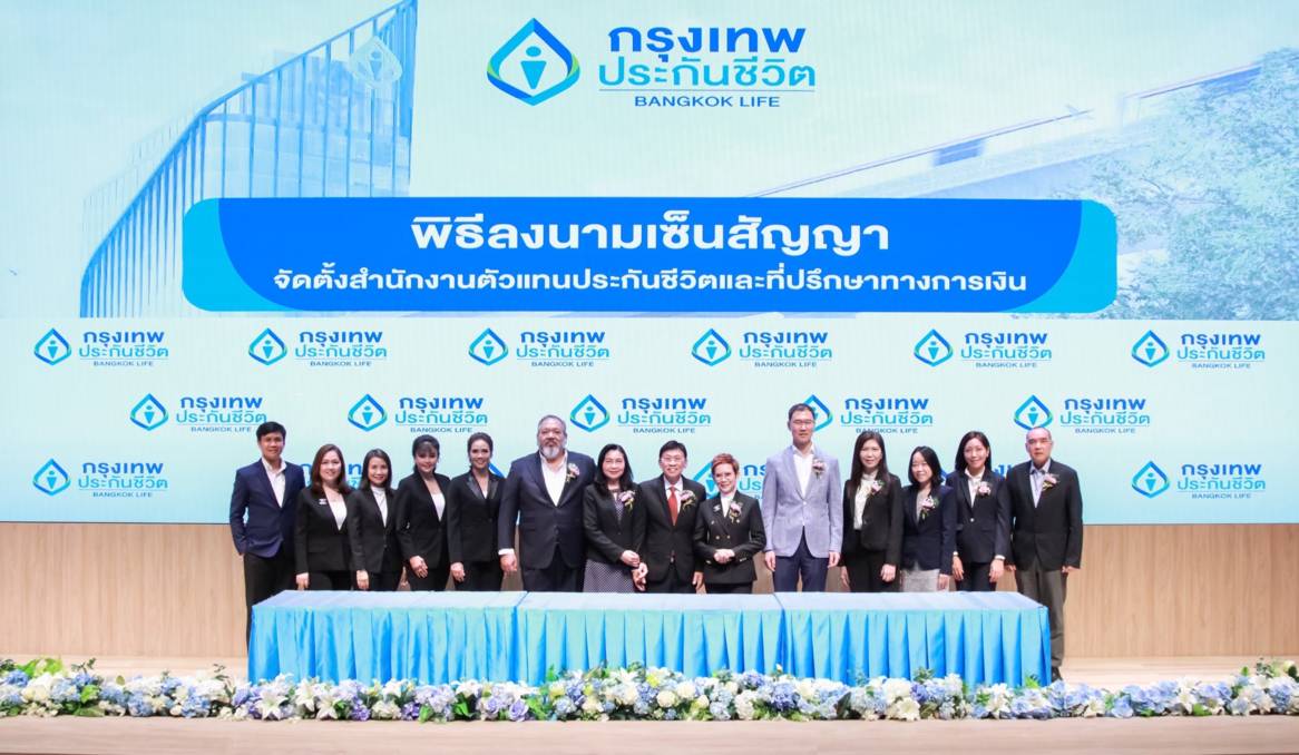บริษัท กรุงเทพประกันชีวิต จำกัด (มหาชน) นำโดย นายโชน โสภณพนิช (ที่ 5 จากขวา) กรรมการผู้จัดการใหญ่และประธานเจ้าหน้าที่บริหาร และ นายอนุชา ภิงคารวัฒน์ (ที่ 6 จากซ้าย) ผู้ช่วยผู้จัดการใหญ่ สายงานตัวแทนและที่ปรึกษาทางการเงิน จัดพิธีลงนามเซ็นสัญญาจัดตั้งสำนักงานตัวแทนประกันชีวิต 2 แห่งใหม่ โดยมีคณะผู้บริหาร นางสาวจารุวรรณ ลิ้มคุณธรรมโม (ที่ 3 จากขวา) ผู้ช่วยผู้จัดการใหญ่ สายบัญชีและการเงิน นางอรนุช สำราญฤทธิ์ (ที่ 4 จากขวา) ผู้ช่วยผู้จัดการใหญ่ สายประกันชีวิต และ นายปรัชญ์ สิงหเสนี (ขวาสุด) ผู้บริหารฝ่ายพัฒนาธุรกิจตัวแทนและที่ปรึกษาทางการเงิน พร้อมคณะผู้บริหารระดับสูงและทีมงานฝ่ายขาย ร่วมแสดงความยินดีและเป็นสักขีพยาน
