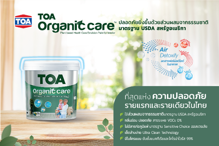 สำหรับสี TOA Organic Care ยังผ่านการรับรองมาตรฐานจาก USDA สหรัฐอเมริกา โดย TOA ได้พัฒนาเทคโนโลยีนี้ร่วมกับบริษัทเคมีชั้นนำระดับโลกจากสหรัฐอเมริกา ด้วยการนำเอาส่วนประกอบจากพืชมาพัฒนาเพื่อใช้ทดแทนวัตถุดิบจากปิโตรเคมี โดยยังให้คุณภาพความคงทนของฟิล์มสีที่ยอดเยี่ยม และที่สำคัญ คือมีคุณสมบัติด้านความปลอดภัยที่เหนือกว่า กลิ่นอ่อนมาก สารระเหย VOCs 0% ไร้สารก่อภูมิแพ้ตามมาตรฐาน Sensitive Choice ออสเตรเลีย ช่วยลดสารฟอร์มัลดีไฮด์ในอากาศด้วยเทคโนโลยี Air Detoxify ผ่านมาตรฐาน LEED V4.1 USA และมาตรฐานอาคารสีเขียว จึงปลอดภัยต่อทุกชีวิตในบ้านและยังเป็นมิตรต่อสิ่งแวดล้อม นอกจากนี้ยังให้คุณภาพความทนทานและการเช็ดล้างที่ยอดเยี่ยม นี่คือความมุ่งมั่นที่ TOA พร้อมสร้างสรรค์สิ่งที่ดีกว่าให้กับทุกคนและโลกใบนี้ และทุกท่านที่มาร่วมงาน สามารถร่วมลุ้นรับของรางวัลได้ที่บูธกิจกรรม TOA เพียงถ่ายรูปกับ ‘กลม กรีน’ และโพสต์ลงในเฟสบุ๊ก พร้อมแฮชแท็กว่า #TOAWOW หรือติดตามข่าวสารความเคลื่อนไหวได้ที่เฟสบุ๊ก TOA Paint แล้วพบกันนะครับ
