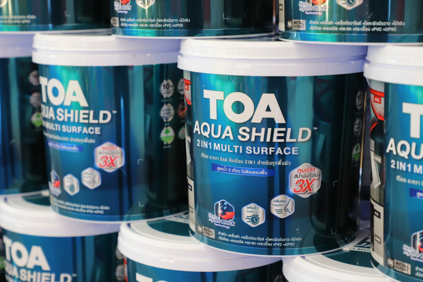 ด้วย ‘TOA AQUA SHIELD’ 2IN1 MULTI SURFACE สีเคลือบทับหน้า รวมรองพื้นกันสนิม สูตรน้ำ สำหรับหลากหลายพื้นผิว เกรดอัลตร้าพรีเมี่ยม ด้วยเทคโนโลยีนาโนอะคริลิกแอดวานซ์โมดิฟายด์จากยุโรป ที่มีอนุภาคขนาดเล็ก แทรกซึมลึกสร้างการยึดเกาะได้ดีเยี่ยมบนหลากหลายพื้นผิว ทั้งเหล็ก โลหะผิวมันวาว กระเบื้องห้องน้ำ กระจก ฯลฯ สูตรน้ำ กลิ่นอ่อน สารระเหยที่เป็นอันตรายต่ำกว่าสีน้ำมันทั่วไป 9 เท่า ฟิล์มสีทนทานมากกว่าสีน้ำมันทั่วไป 3 เท่า ไม่ต้องทารองพื้น ไม่ต้องผสมทินเนอร์ ไม่ต้องผสมน้ำ เปิดประป๋องใช้งานได้ทันที พร้อมส่วนผสมเทคโนโลยีพิเศษจาก TOA ที่ช่วยป้องกันสนิม ยางไม้ และด่างในปูนได้อย่างยอดเยี่ยม ทนทานทุกสภาวะ แห้งตัวเร็วใน 1 ชั่วโมง ผ่านมาตรฐาน ความปลอดภัยต่อการใช้งานระดับโลกทั้ง LEED 4.1 และ WELL นับเป็นนวัตกรรมที่ยอดเยี่ยม เป็นทางเลือกที่ดีขึ้นไปอีกขั้นให้กับผู้บริโภค”