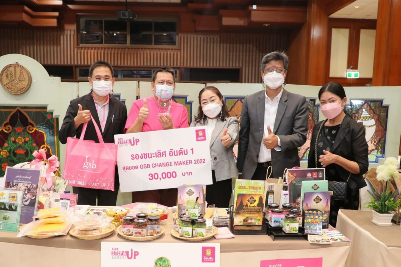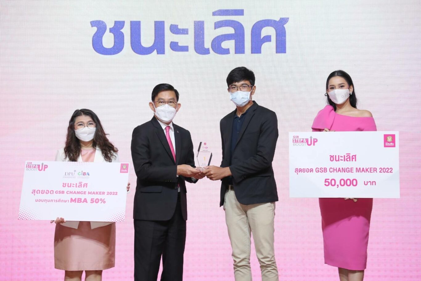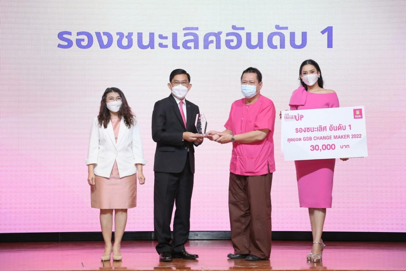 นางปรางมาศ เธียรธนู พร้อมด้วย นายสัณฐาน อยู่ศิริ รองผู้อำนวยการธนาคารออมสิน ร่วมเป็นประธานในพิธีมอบรางวัล “สุดยอด GSB Change Maker 2022” ซึ่งเป็นการประกวดแผนธุรกิจเพื่อต่อยอด ภายใต้โครงการพัฒนาศักยภาพทางธุรกิจ Step & Boost up Program ประจำปี 2565