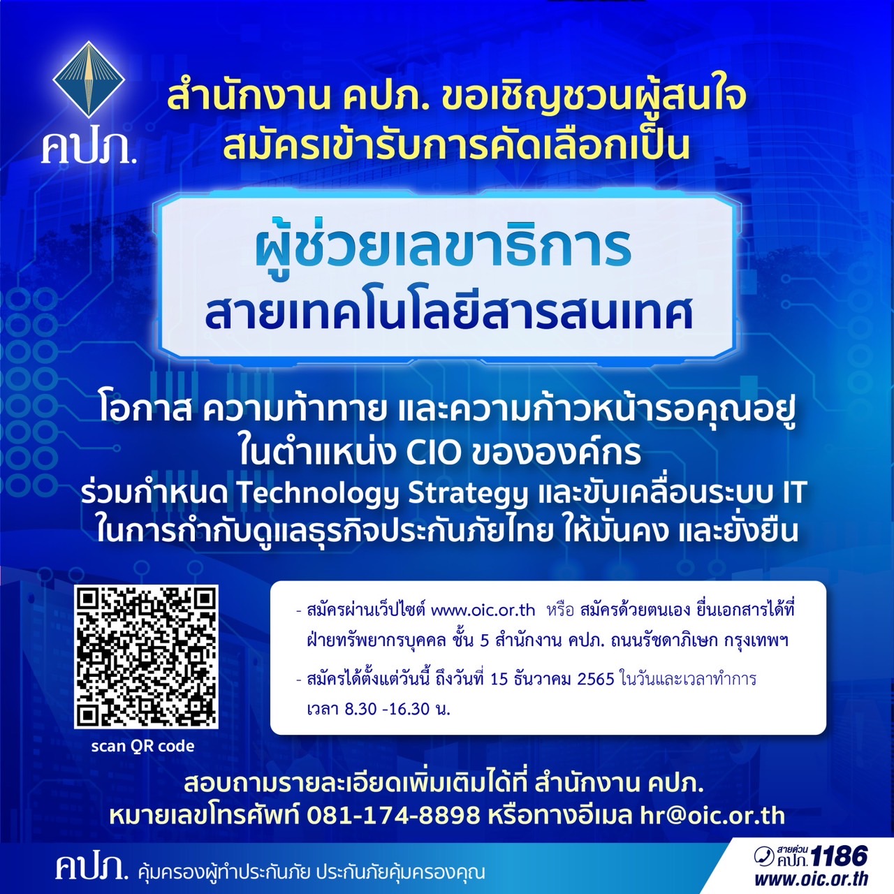 สำนักงาน คปภ. ขอเชิญชวนผู้สนใจ สมัครเข้ารับการคัดเลือกเป็นผู้ช่วยเลขาธิการ สายเทคโนโลยีสารสนเทศ