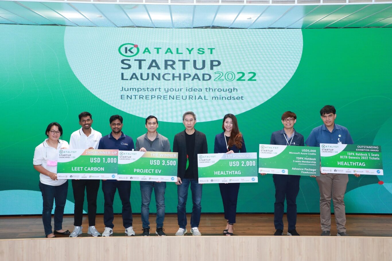 ผลการแข่งขัน ทีมชนะเลิศได้แก่ ทีมโปรเจค อีวี (Project EV) โซลูชั่นแบบครบวงจรเพื่อดัดแปลงรถยนต์สันดาปภายใน (Internal Combustion Engine: ICE) เป็นรถยนต์ไฟฟ้า (Electric Vehicle: EV) สำหรับธุรกิจขนส่งโลจิสติกส์ อันดับที่ 2 ทีม HealthTAG ผู้ให้บริการทางด้านการจัดการข้อมูลทางการแพทย์ด้วยเทคโนโลยี Blockchain เพื่อให้เกิดการเเลกเปลี่ยน เชื่อมโยง และบูรณาการข้อมูลสุขภาพแบบไร้รอยต่อโดยผู้ป่วยเป็นศูนย์กลาง อันดับที่ 3 ทีม LEET CARBON ให้บริการโซลูชั่นในการจัดการ ติดตามและตรวจสอบโครงการคาร์บอนเครดิตด้วยข้อมูลเชิงพื้นที่และข้อมูลพื้นฐานธรรมชาติ เพื่อการแก้ปัญหา (Nature Based Solution) อย่างมีประสิทธิภาพและโปร่งใสโดยทั้ง 3 ทีม ได้รับรางวัลจากโครงการทั้งเงินรางวัลและผลิตภัณฑ์เพื่อต่อยอดธุรกิจ มูลค่ารวมกว่า 800,000 บาท ทั้งนี้ ผู้ที่เข้าร่วมโครงการและผ่านเกณฑ์ของหลักสูตรนี้ทุกทีม จะได้รับประกาศนียบัตรจากโครงการ KATALYST by KBank และเอกสารยืนยันการเข้าร่วมและสำเร็จหลักสูตรการเรียนรู้แบบออนไลน์ จาก Stanford Online ซึ่งเป็นใบเบิกทางและโอกาสสำคัญในการขยายเครือข่ายทางธุรกิจกับบริษัทชั้นนำมากมายทั้งในประเทศและต่างประเทศอีกด้วย