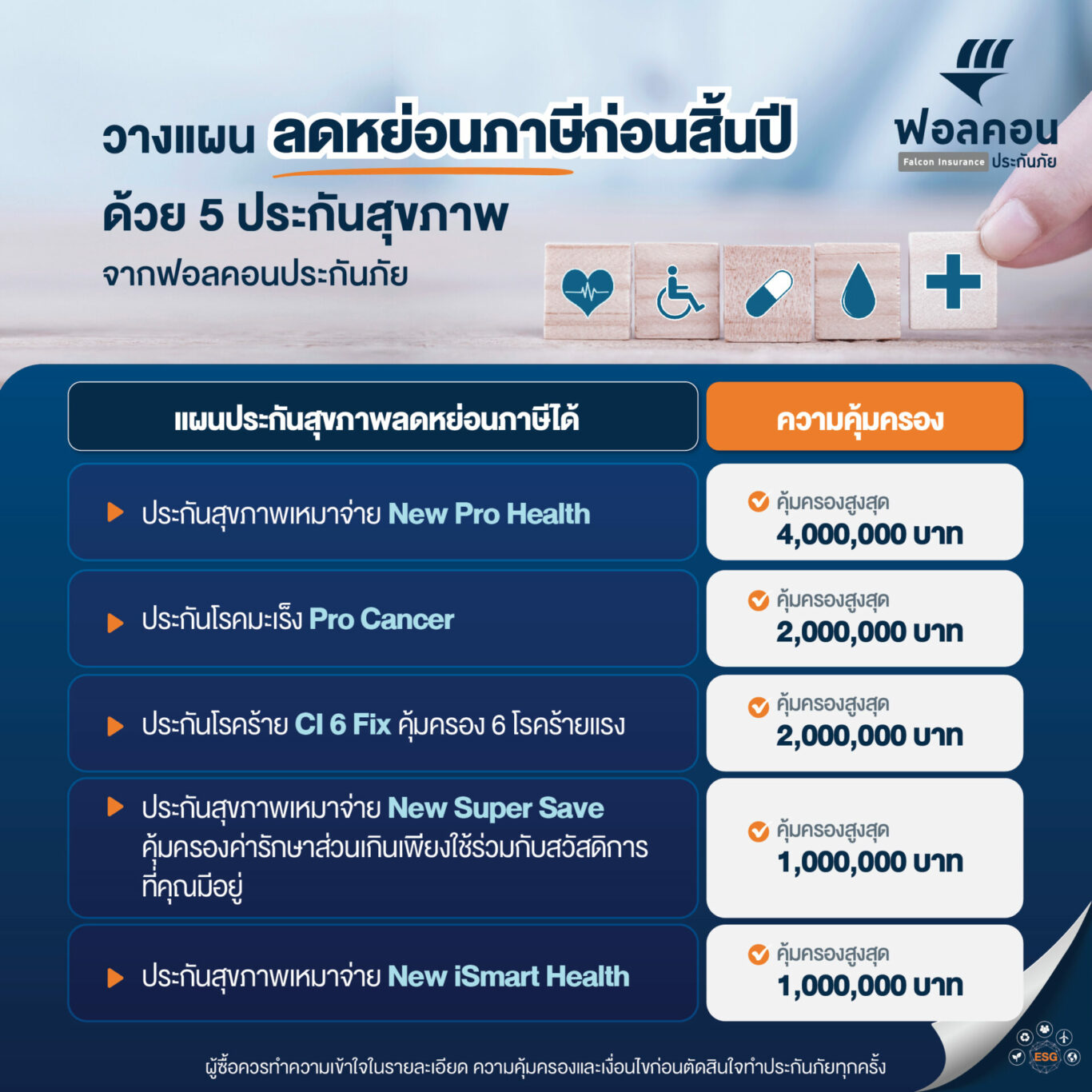 5 แผนประกันสุขภาพตจากฟอลคอนประกันภัยที่เข้าใจง่าย ไม่ซับซ้อน มีความคุ้มครองหลากหลายรูปแบบเพื่อเป็นทางเลือกให้กับผู้ที่กำลังมองหาประกันสุขภาพที่สามารถนำเบี้ยประกันไปลดหย่อนภาษีได้สูงสุด 25,000 บาท อาทิ