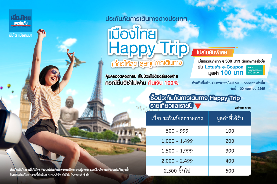 เมืองไทยประกันภัย หรือ MTI ต้อนรับการเดินทางข้ามประเทศ ชูประกันภัยการเดินทางต่างประเทศ “เมืองไทย Happy Trip” เที่ยวให้สุด ลุยทุกการเดินทาง ทั้งรายเที่ยวและรายปีให้ความคุ้มครองตลอดทริป เจ็บป่วยไม่ต้องสํารองจ่าย วงเงินช่วยเหลือฉุกเฉินสูงสุดถึง 30 ล้านบาท และกรณียื่นวีซ่าไม่ผ่าน คืนเงิน 100% คุ้มครองทรัพย์สิน การพลาดการต่อเที่ยวบิน หรือเที่ยวบินล่าช้า รวมถึงค่ารักษาต่อเนื่องในประเทศไทย เตรียมตัวพร้อมลุยทุกทริปด้วยโปรโมชันพิเศษ สําหรับลูกค้าที่ทํารายการซื้อและมีเบี้ยประกันภัยครบทุก ๆ 500 บาท ต่อรายการสั่งซื้อ รับทันที Lotus’s e-Coupon มูลค่า 100 บาท สูงสุดถึง 500 บาท เฉพาะช่องทางออนไลน์ MTI Connect เท่านั้น สัมผัสประสบการณ์ท่องเที่ยวให้สุดได้ตั้งแต่วันนี้ – 31 ธันวาคม 2565