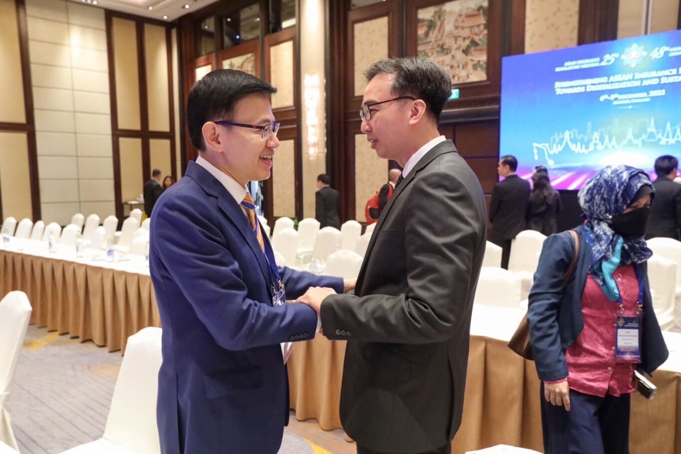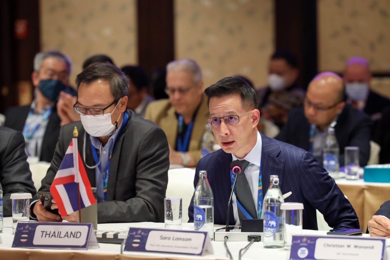 โดยเฉพาะในช่วง 1-2 ปีที่ผ่านมา หลังจากการแพร่ระบาดของโรคโควิด-19 ซึ่งเป็นความเสี่ยงภัยที่อุบัติใหม่ และส่งผลทำให้ระบบประกันภัยมีความโดดเด่นในเรื่องของการรับประกันภัยจากการเจ็บป่วยด้วยโรคโควิด-19 แต่ยังมีข้อจำกัดบางประการที่จะต้องใช้เป็นบทเรียนเพื่อปรับปรุงในการออกแบบผลิตภัณฑ์ใหม่ ๆ ต่อไป ซึ่งตนมองว่าธุรกิจประกันภัยอาเซียนควรหันมาเน้นการออกผลิตภัณฑ์ประกันภัยความยั่งยืนเพื่อรองรับกระแสโลกที่ให้ความสำคัญเศรษฐกิจ ESG เพื่อปรับการบริหารงานขององค์กรให้มีความรับผิดชอบต่อสิ่งแวดล้อม สังคม ธรรมาภิบาล และร่วมกันดูแลภาวะโลกร้อน ด้วยการออกผลิตภัณฑ์ประกันภัยที่มีส่วนดูแลสิ่งแวดล้อม ในส่วนของประเทศไทยได้มีกรมธรรม์ในลักษณะให้ความคุ้มครองทั้งภัยธรรมชาติและประกันภัยพืชผลทางการเกษตร ซี่งประเทศไทยได้ให้ความคุ้มครองภัยแก่เกษตรกรมานานหลายปีแล้ว ในรูปแบบของการประกันภัยข้าวนาปีและข้าวโพดเลี้ยงสัตว์ นอกจากนี้ตนอยากให้เวทีการประชุมในครั้งนี้มีการหารือเกี่ยวกับการประกันสุขภาพเพื่อรองรับสังคมผู้สูงอายุ เพื่อนำไปสู่แนวทางการกำกับดูแลผลิตภัณฑ์ประกันสุขภาพให้มีความรัดกุมและสอดคล้องกับกฎ กติกา ของกลุ่มประเทศอาเซียน เพื่อให้เกิดประโยชน์สูงสุดต่อภาคประกันภัยไทย