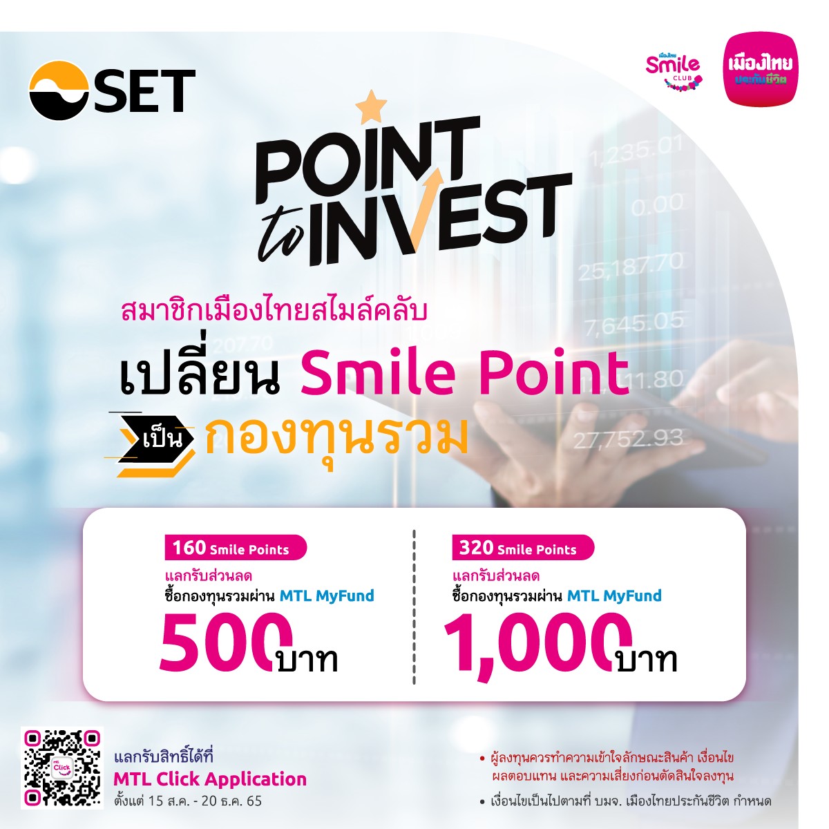 ล่าสุด เมืองไทยประกันชีวิต ร่วมกับ ตลาดหลักทรัพย์แห่งประเทศไทย เปิดตัวโครงการ “Smile Point to Invest” ทางเลือกใหม่สำหรับสมาชิกเมืองไทยสไมล์คลับ สร้างประสบการณ์เหนือระดับทางการเงิน ด้วยทางเลือกใหม่ เพียงเปลี่ยนคะแนนสะสม Smile Point เป็นกองทุนรวม เพิ่มโอกาสสร้างความมั่งคั่ง ให้การลงทุนเป็นเรื่องที่เข้าถึงง่ายและใกล้ตัว เริ่มต้นลงทุนได้ง่ายแบบไม่ต้องใช้เงิน โดยสามารถทำรายการผ่านบัญชีกองทุนรวม MTL MyFund โดยมอบสิทธิพิเศษสุดๆ สำหรับสมาชิกเมืองไทยสไมล์คลับ ที่เปิดบัญชีใหม่ผ่าน MTL MyFund และแลกคะแนนสะสม Smile Point รับโปรโมชั่น 2 ต่อ ดังนี้ ต่อที่ 1 สำหรับผู้ที่เปิดบัญชีกองทุนรวมผ่าน MTL MyFund ระหว่างวันที่ 15 สิงหาคม ถึง 30 ธันวาคม 2565 รับบัตร Central Gift Voucher มูลค่า 100 บาท (1 ท่าน ต่อ 1 สิทธิ์การเปิดบัญชี) ต่อที่ 2 สำหรับสมาชิกเมืองไทยสไมล์คลับ ที่เปิดบัญชีกองทุนรวมและแลกคะแนน เพื่อซื้อหน่วยลงทุนรับเพิ่ม Starbucks e-Coupon มูลค่า 100 บาท จากตลาดหลักทรัพย์แห่งประเทศไทย (สำหรับผู้เข้าร่วม 1 ท่านต่อ 1 สิทธิ์ตลอดรายการและจำกัด 3,000 สิทธิ์ตลอดโครงการ) โดยสมาชิกเมืองไทยสไมล์คลับ สามารถแลกคะแนนสะสม Smile Point ผ่านแอปพลิเคชัน MTL Click ตั้งแต่วันนี้ – 20 ธันวาคม 2565 (หรือจนกว่าสิทธิ์จะเต็ม) และใช้สิทธิ์ภายในวันที่ 30 ธันวาคม 2565