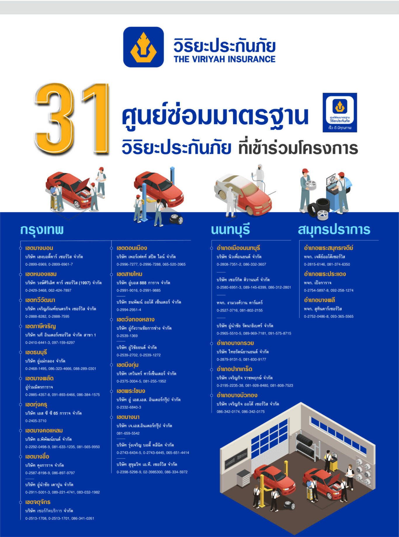 สำหรับศูนย์ซ่อมมาตรฐานวิริยะประกันภัยที่เข้าร่วมโครงการให้บริการตรวจรถฟรี จำนวน 31 แห่ง ได้แก่ 1) บริษัท เฮงบอดี้คาร์ เซอร์วิส จำกัด 2) บริษัท วงษ์ศิริเลิศ คาร์ เซอร์วิส (1997) จำกัด 3) บริษัท เจริญภัณฑ์ยนตรกิจ เซอร์วิส จำกัด 4) บริษัท นที อินเตอร์เซอร์วิส จำกัด สาขา 1 5) บริษัท อู่แม่กลอง จำกัด 6) อู่ร่วมมิตรการาจ 7) บริษัท เอส ซี ซี 65 การาจ จำกัด 8) บริษัท อ.พิพัฒน์ จำกัด 9) บริษัท คุงการาจ จำกัด 10) บริษัท อู่นำชัย เตาปูน จำกัด 11) บริษัท เซอร์กิตบริการ จำกัด 12) บริษัท เพอร์เฟคท์ สปีด ไลน์ จำกัด 13) บริษัท อู่บอส 888 การาจ จำกัด 14) บริษัท ธนพัฒน์ ออโต้ เซ็นเตอร์ จำกัด 15) บริษัท อู่กังวานชัยการช่าง จำกัด 16) บริษัท อู่วิชัยยนต์ จำกัด 17) บริษัท เทวินทร์ คาร์เซ็นเตอร์ จำกัด 18. บริษัท อู่ เอส.เอส. อินเตอร์กรุ๊ป จำกัด 19) บริษัท เจ.เอส.อินเตอร์กรุ๊ป จำกัด 20) บริษัท รุ่งเจริญ บอดี้ คลีนิค จำกัด 21. บริษัท สุขุมวิท เอ.ที. เซอร์วิส 22) บริษัท นิวเพื่อนยนต์ จำกัด 23) บริษัท เซอร์กิต ติวานนท์ จำกัด 24) หจก. งามวงศ์วาน คาร์แคร์ 25) บริษัท อู่นำชัย รัตนาธิเบศร์ จำกัด 26. บริษัท ไทยรัตน์ยานยนต์ จำกัด 27) บริษัท เจริญกิจ ราชพฤกษ์ จำกัด 28) บริษัท เจริญกิจ ออโต้ เซอร์วิส จำกัด 29) หจก. เจดีย์ออโต้เซอร์วิส 30) หจก.เป้งการาจ 31) หจก.สุทินคาร์เซอร์วิส