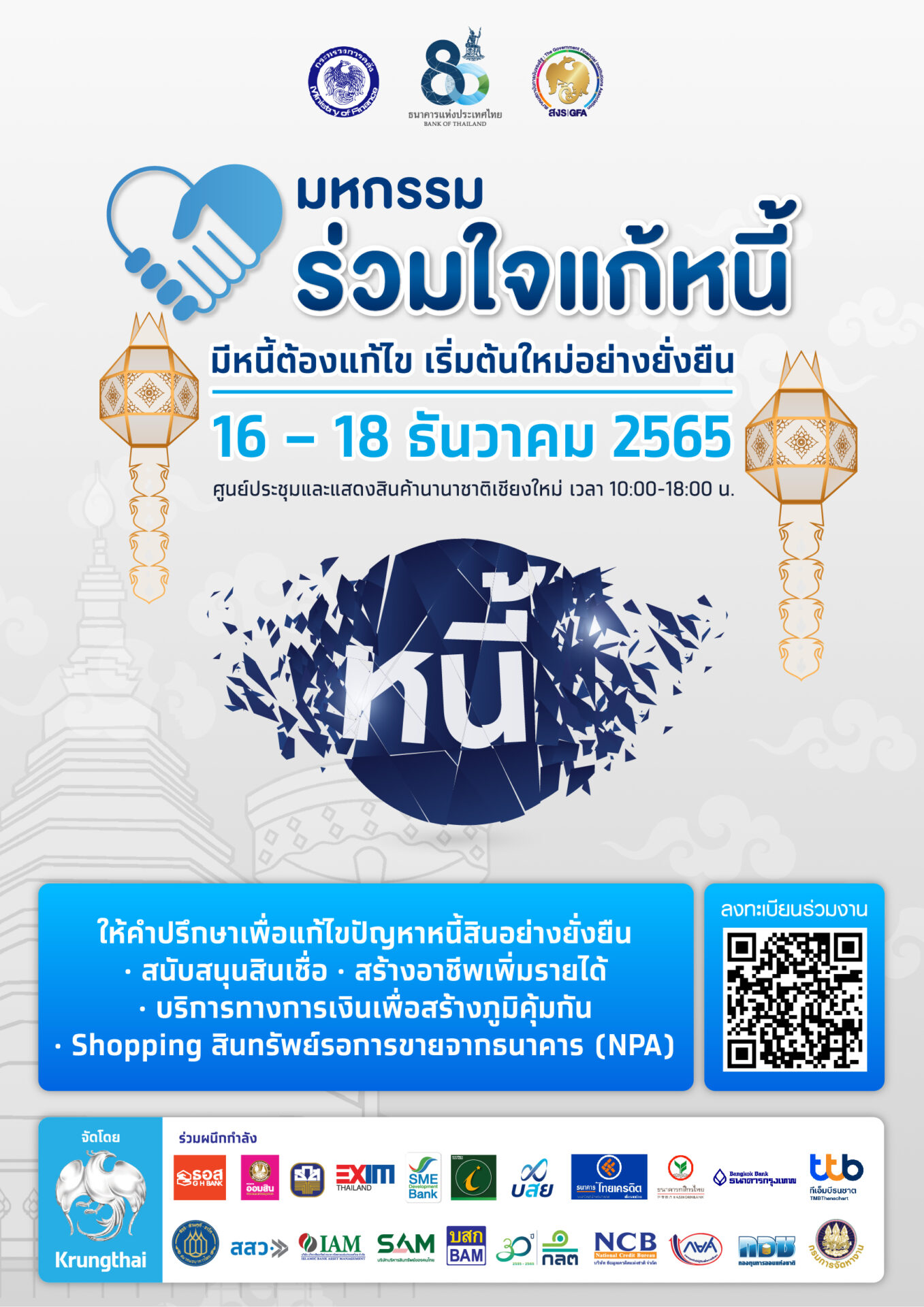 สำหรับงานมหกรรมร่วมใจแก้หนี้ มีหนี้ต้องแก้ไข เริ่มต้นใหม่อย่างยั่งยืนสัญจร ครั้งที่ 3 ซึ่งกำหนดจัดขึ้นระหว่างวันที่ 16 – 18 ธันวาคม 2565 ณ ศูนย์ประชุมและแสดงสินค้านานาชาติเชียงใหม่ ธ.ก.ส. ได้วางมาตรการแก้ไขปัญหาหนี้ เริ่มตั้งแต่การตรึงอัตราดอกเบี้ยเงินกู้ในช่วงขาขึ้นขณะนี้ออกไปให้นานที่สุด เพื่อมิให้เป็นภาระต้นทุนกับลูกค้าในช่วงการฟื้นตัว การจัดทำโครงการชำระดีมีคืน จำนวน 3,000 ล้านบาทให้กับลูกค้าที่ชำระหนี้ ตั้งแต่วันนี้ถึง 31 มีนาคม 2566 การดูแลภาระหนี้สินเดิม เพื่อลดความกังวลใจในเรื่องหนี้ เช่น การปรับปรุงโครงสร้างหนี้และการเลื่อนงวดในการชำระหนี้ผ่านมาตรการจ่ายดอกตัดต้น มาตรการทางด่วนลดหนี้ การไกล่เกลี่ยหนี้ การจัดทำคลินิกหมอหนี้เพื่อลดหนี้ครัวเรือน การให้คำปรึกษาด้านการจัดการหนี้ ทั้งหนี้ในและนอกระบบ การพัฒนาเพื่อเพิ่มศักยภาพในการประกอบอาชีพ เช่น การให้ความรู้ด้าน Financial Literacy/Digital Literacy การร่วมกับภาคีเครือข่ายภาครัฐเอกชน สถาบันการศึกษา ในการศึกษาดูงาน การฝึกปฏิบัติเพิ่มทักษะ ทั้งอาชีพเดิม อาชีพเสริม อาชีพใหม่ การปรับเปลี่ยนการผลิตไปปลูกพืชที่มีมูลค่าสูง การลดต้นทุนการผลิตโดยใช้เทคโนโลยีและนวัตกรรม การเติมสินเชื่อใหม่ ภายใต้อัตราดอกเบี้ยที่ผ่อนปรน เพื่อเสริมสภาพคล่องในการใช้จ่ายและการลงทุน เช่น สินเชื่อสานฝันสร้างอาชีพ สินเชื่อนวัตกรรมดีมีเงินทุน อัตราดอกเบี้ย ร้อยละ 4 เป็นต้น การสนับสนุนช่องทางด้านการตลาดในทุกระดับ ทั้งตลาดในระดับท้องถิ่น ตลาด Modern trade ตลาด E-Commerce ควบคู่การสร้างภูมิคุ้มกันเพื่อป้องกันความเสี่ยง ผ่านเงินฝาก A-Savings เงินฝากประจำ เงินฝากสงเคราะห์ชีวิต สลากดิจิทัล ธ.ก.ส. กองทุนทวีสุข กองทุนเงินออมแห่งชาติ และการประกันภัยทางการเกษตร เป็นต้น