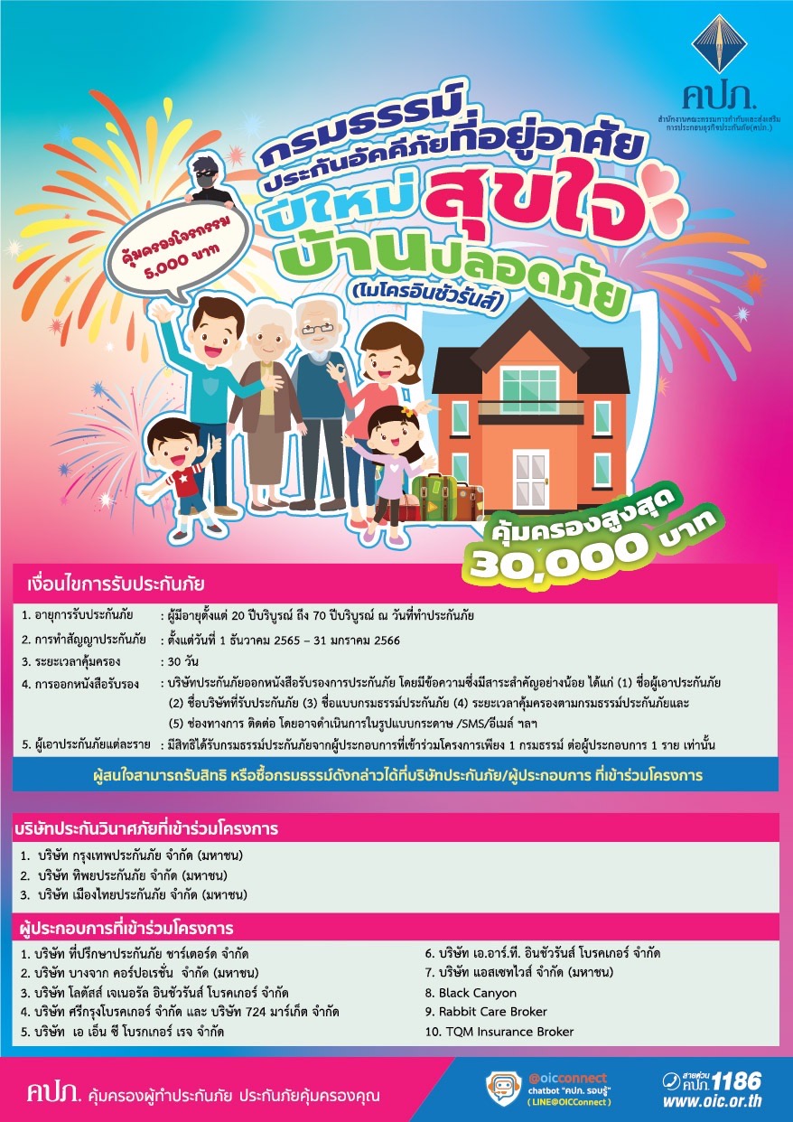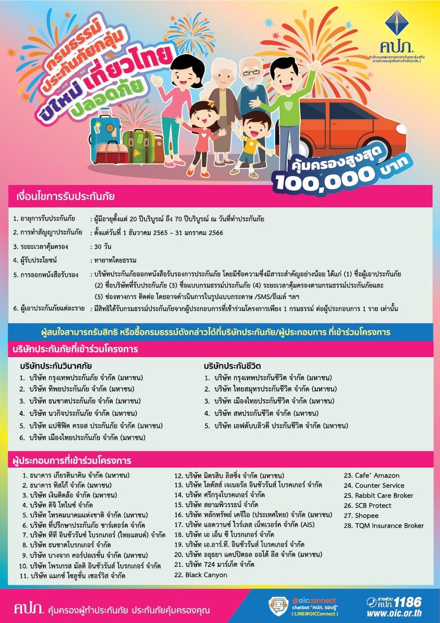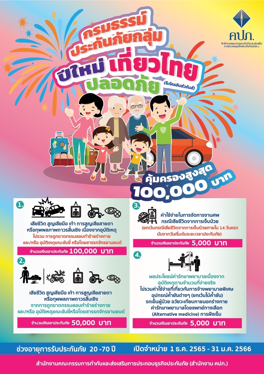คปภ. ส่งมอบของขวัญปีใหม่ให้ประชาชนอุ่นใจด้วยความคุ้มครองด้านประกันภัย เปิดตัว 2 กรมธรรม์ใหม่ “ประกันภัยกลุ่มปีใหม่เที่ยวไทยปลอดภัย (ไมโครอินชัวรันส์) ระยะเวลา 30 วัน คุ้มครองอุบัติเหตุสูงสุด 100,000 บาท และ “ประกันอัคคีภัยที่อยู่อาศัยปีใหม่สุขใจบ้านปลอดภัย (ไมโครอินชัวรันส์)” ระยะเวลา 30 วัน คุ้มครองสูงสุด 30,000 บาท พร้อมจัดกิจกรรมต้นแบบ “ขึ้นเหนือ ล่องใต้ ไปอีสาน ไปทะเลตะวันตก” สแกน QR Code เพื่อลงทะเบียนรับกรมธรรม์ประกันภัยกลุ่มปีใหม่เที่ยวไทยปลอดภัย (ไมโครอินชัวรันส์) ฟรี..! ทั้งนี้หากมีปัญหาด้านประกันภัยช่วง 7 วันอันตราย สายด่วน คปภ. 1186 เปิดให้บริการตลอด 24 ชั่วโมง