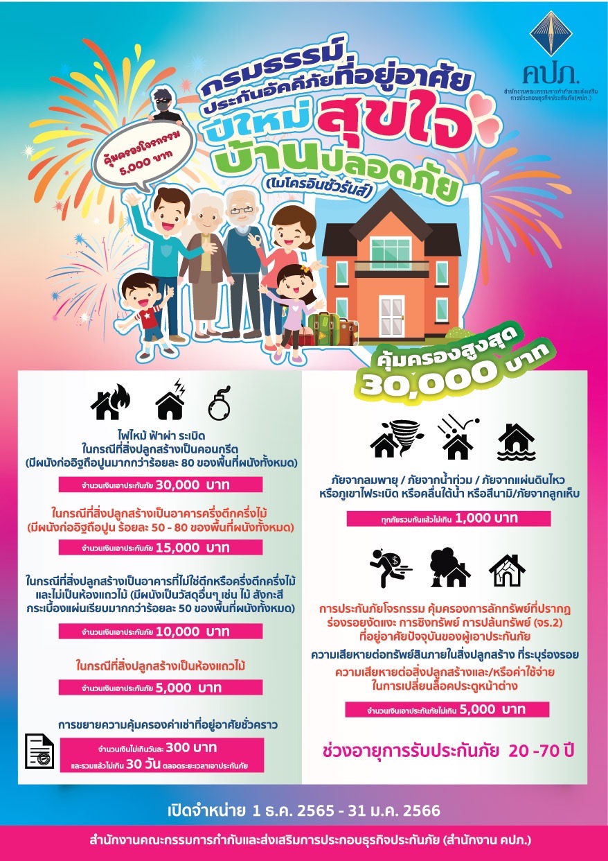 มีรายละเอียดความคุ้มครอง ได้แก่ กรณีที่อยู่อาศัยได้รับความเสียหายจาก ไฟไหม้ /ฟ้าผ่า/ระเบิด ความคุ้มครองขึ้นอยู่กับสิ่งปลูกสร้าง ได้แก่ สิ่งปลูกสร้างเป็นคอนกรีต (มีผนังก่ออิฐถือปูนมากกว่าร้อยละ 80 ของพื้นที่ผนังทั้งหมด) ได้รับความคุ้มครอง 30,000 บาท สิ่งปลูกสร้างเป็นอาคารครึ่งตึกครึ่งไม้ (มีผนังก่ออิฐถือปูน ร้อยละ 50 – 80 ของพื้นที่ผนังทั้งหมด) ได้รับความคุ้มครอง 15,000 บาท สิ่งปลูกสร้างเป็นอาคารที่ไม่ใช่ตึกหรือครึ่งตึกครึ่งไม้และไม่เป็นห้องแถวไม้ (มีผนังเป็นวัสดุอื่น ๆ เช่น ไม้ สังกะสี กระเบื้องแผ่นเรียบมากกว่าร้อยละ 50 ของพื้นที่ผนังทั้งหมด) ได้รับความคุ้มครอง 10,000 บาท สิ่งปลูกสร้างเป็นห้องแถวไม้ ได้รับความคุ้มครอง 5,000 บาท กรณีที่อยู่อาศัยได้รับความเสียหายจาก ลมพายุ /น้ำท่วม/แผ่นดินไหว/ภูเขาไฟระเบิด/คลื่นใต้น้ำ/สึนามิ/ลูกเห็บ ทุกภัยรวมกันได้รับความคุ้มครองไม่เกิน 1,000 บาท การขยายความคุ้มครองค่าเช่าที่อยู่อาศัยชั่วคราว จำนวนเงินไม่เกินวันละ 300 บาท และรวมแล้วไม่เกิน 30 วัน ตลอดระยะเวลาเอาประกันภัย รวมทั้ง การประกันภัยโจรกรรม คุ้มครองการลักทรัพย์ที่ปรากฏร่องรอยงัดแงะ การชิงทรัพย์ การปล้นทรัพย์ ที่อยู่อาศัยปัจจุบันของผู้เอาประกันภัย ความเสียหายต่อทรัพย์สินภายในสิ่งปลูกสร้างที่ระบุร่องรอย ความเสียหายต่อสิ่งปลูกสร้างและ/หรือค่าใช้จ่ายในการเปลี่ยนล็อคประตูหน้าต่าง จำนวนเงินเอาประกันภัยไม่เกิน 5,000 บาท