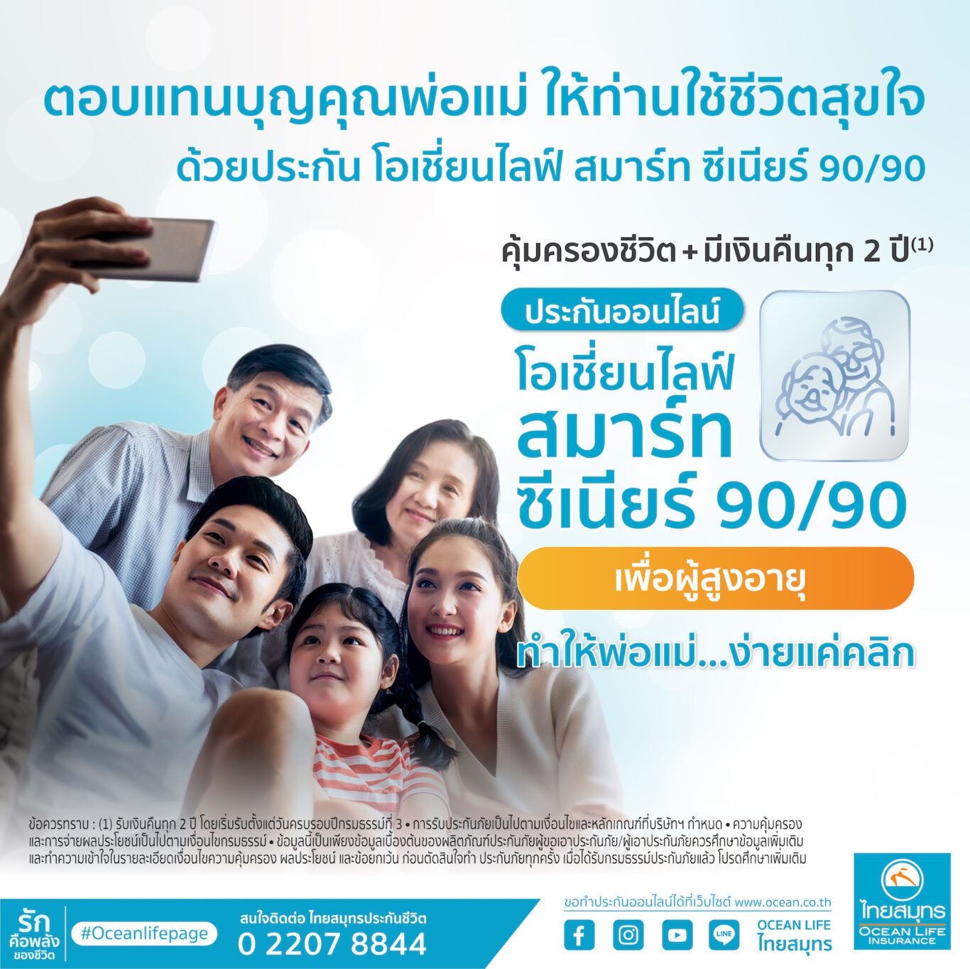 บมจ.ไทยสมุทรประกันชีวิต รักคือพลังของชีวิต โดย นางนุสรา (อัสสกุล) บัญญัติปิยพจน์ ประธานเจ้าหน้าที่บริหารและกรรมการผู้จัดการ (CEO) ได้ให้ความสำคัญต่อการก้าวเข้าสู่การเป็นสังคมผู้สูงอายุ (Aging Society) อย่างเต็มรูปแบบของประเทศไทย ดังนั้น เพื่อเตรียมความพร้อมรับมือกับสังคมผู้สูงอายุ และภาระค่าใช้จ่ายที่อาจเกิดขึ้นอย่างไม่คาดคิด ทั้งค่าครองชีพ ภาวะเงินเฟ้อ หรือแม้แต่ค่ารักษาพยาบาลที่สูงขึ้น ล่าสุด! OCEAN LIFE ไทยสมุทร ได้เปิดตัวแบบประกันเพื่อผู้สูงอายุ “โอเชี่ยนไลฟ์ สมาร์ท ซีเนียร์ 90/90” ให้ลูก ๆ ได้ตอบแทนพระคุณของพ่อแม่ ด้วยการทำให้ท่านมีความสุขใจในการใช้ชีวิตในบั้นปลายชีวิต พร้อมมีเงินคืนระหว่างสัญญาทุก 2 ปี ครั้งละ 3% ของจำนวนเงินเอาประกันภัย เริ่มรับตั้งแต่สิ้นปีกรมธรรม์ที่ 3 พร้อมความคุ้มครองชีวิตสูงสุด 160% ของจำนวนเงินเอาประกันภัย ในระหว่างปีกรมธรรม์ที่ 19 จนถึงปีกรมธรรม์ที่อายุครบ 90 ปี และหากมีชีวิตอยู่ ณ วันครบกำหนดสัญญารับเงินครบกำหนดสัญญา 180% ของจำนวนเงินเอาประกันภัย “โอเชี่ยนไลฟ์ สมาร์ท ซีเนียร์ 90/90” รับประกันภัยบุคคลที่มีอายุ 50 ปี – 70 ปี โดยไม่ต้องตรวจสุขภาพและไม่ต้องตอบคำถามสุขภาพใด ๆ สมัครง่าย ๆ ผ่านช่องทางออนไลน์ สะดวก ทุกที่ทุกเวลา เพียงคลิก