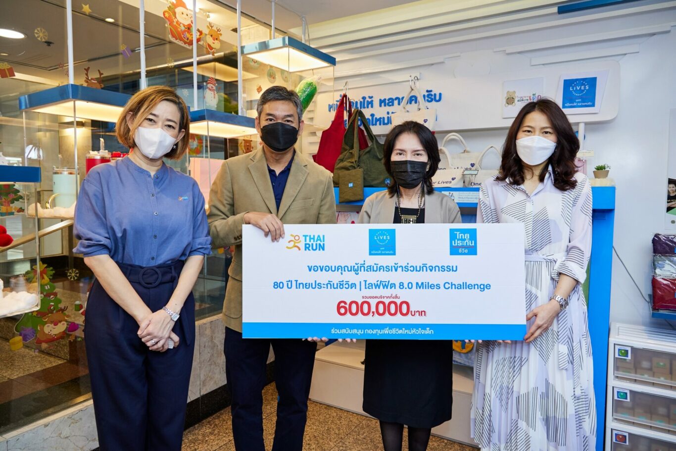 นางสาวฐิติมา เลี้ยงพาณิชย์ ผู้อำนวยการฝ่าย กลุ่มสื่อสารองค์กร บริษัท ไทยประกันชีวิต จำกัด (มหาชน) และ นายประวีณ มากบุญส่ง COO บริษัท ไทยดอทรัน จำกัด ร่วมมอบเงินบริจาคจำนวน 600,000 บาท จากการจัดกิจกรรม 80 ปี ไทยประกันชีวิต ไลฟ์ฟิต 8.0 Miles Challenge แก่ นางสาวภาสินี ปรีชาธนาพล กรรมการและเลขานุการ มูลนิธิหนึ่งคนให้ หลายคนรับ เพื่อสมทบทุนโครงการ “หนึ่งคนให้ หลายคนรับ เพื่อชีวิตใหม่หัวใจเด็ก” สำหรับเป็นค่าใช้จ่ายผ่าตัดผู้ป่วยเด็กโรคหัวใจที่ขาดแคลนทุนทรัพย์ ณ อาคารไทยประกันชีวิต สำนักงานใหญ่